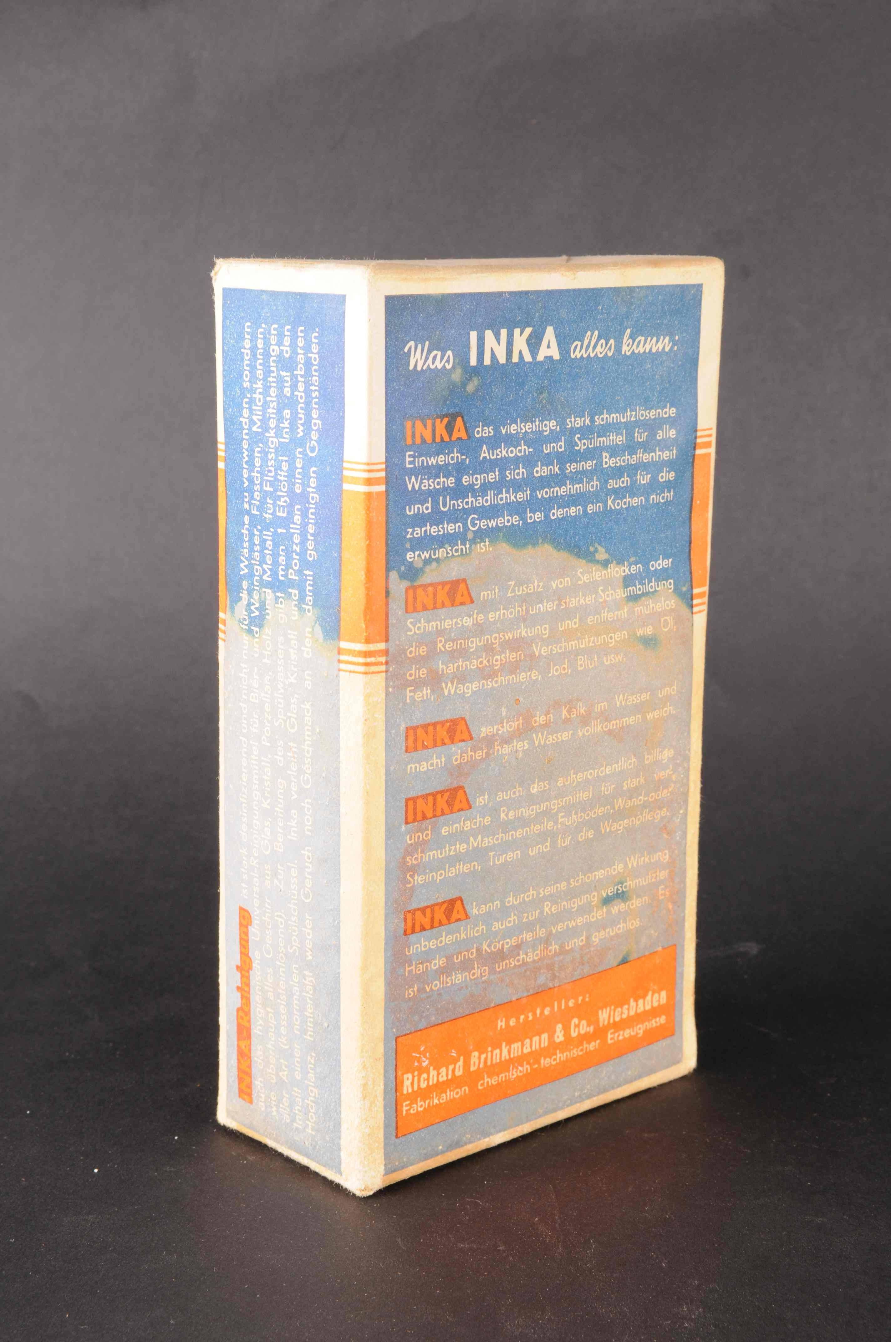 Dit is een historische verpakking van het Duitse waspoedermerk JNKA. Het pakket heeft een opvallend kleurenschema met blauw en oranje, en adverteert een veelzijdig was- en reinigingsmiddel, gegarandeerd zonder chloor en zonder soda. Het gewicht van de inhoud wordt vermeld als 500 gram. Op de voorzijde staat 'Jede Wäsche mit JNKA', wat suggereert dat het ...