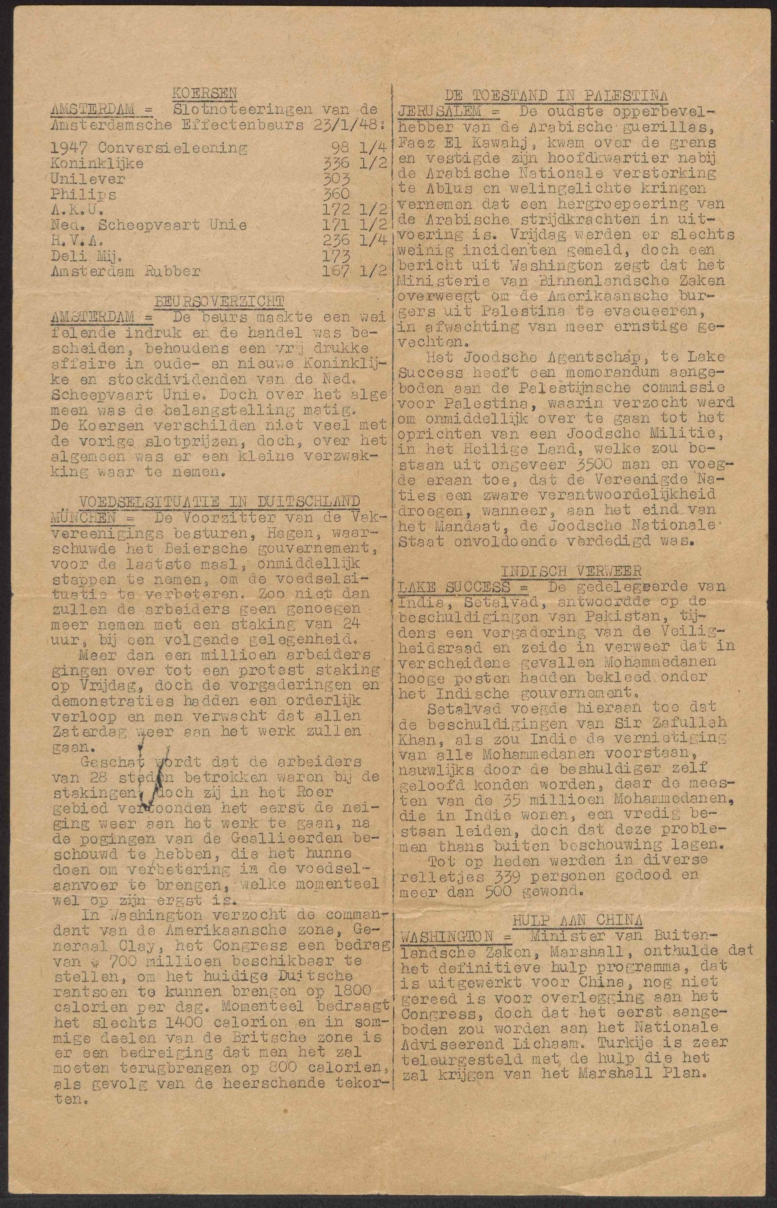 Tweedelige krant, getiteld De Oceaanpost, uitgegeven aan boord van het passagiersschip Johan van Oldenbarnevelt op zondag 25 januari 1948. Deze krant werd speciaal samengesteld voor de bemanningsleden aan boord en bevatte samenvattingen van het internationale nieuws, beurskoersen, politieke ontwikkelingen, en weersinformatie. De krant werd verspreid via radioverbindingen (Wireless Press – Radio-Holland) en is een goed ...