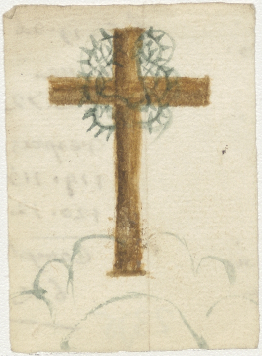 Kruis met doornenkroon, ingekleurd, kz. fragment met tekst