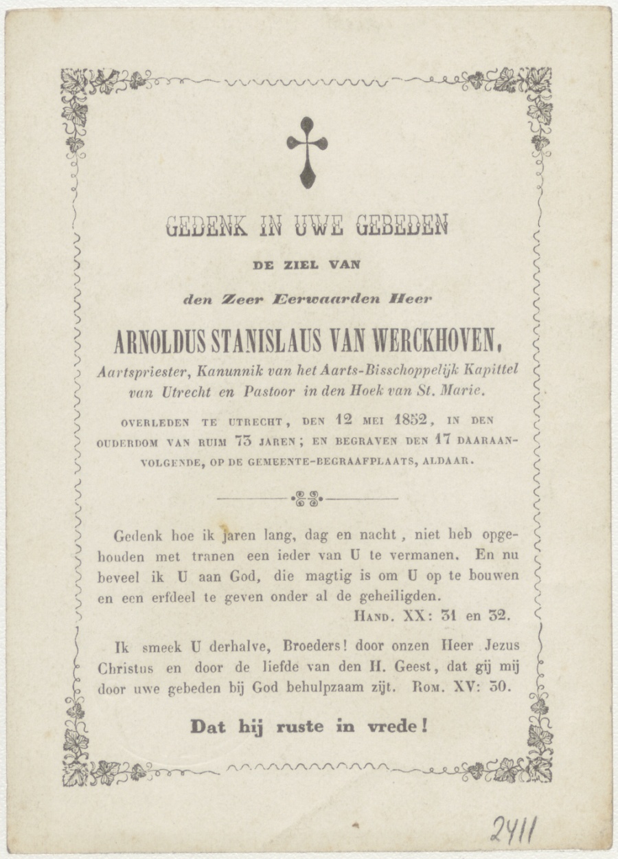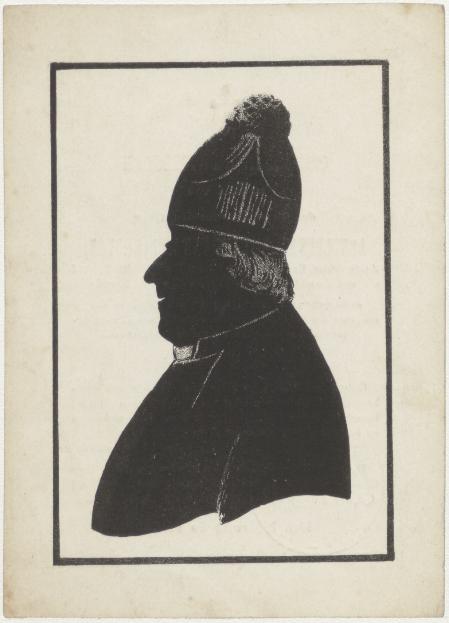 Portretsilhouet Arnoldus van Werckhoven (+1852), kz. religieus; bid voor ziel aartspriester en kanunnik van het aartsbisschoppelijk kapittel