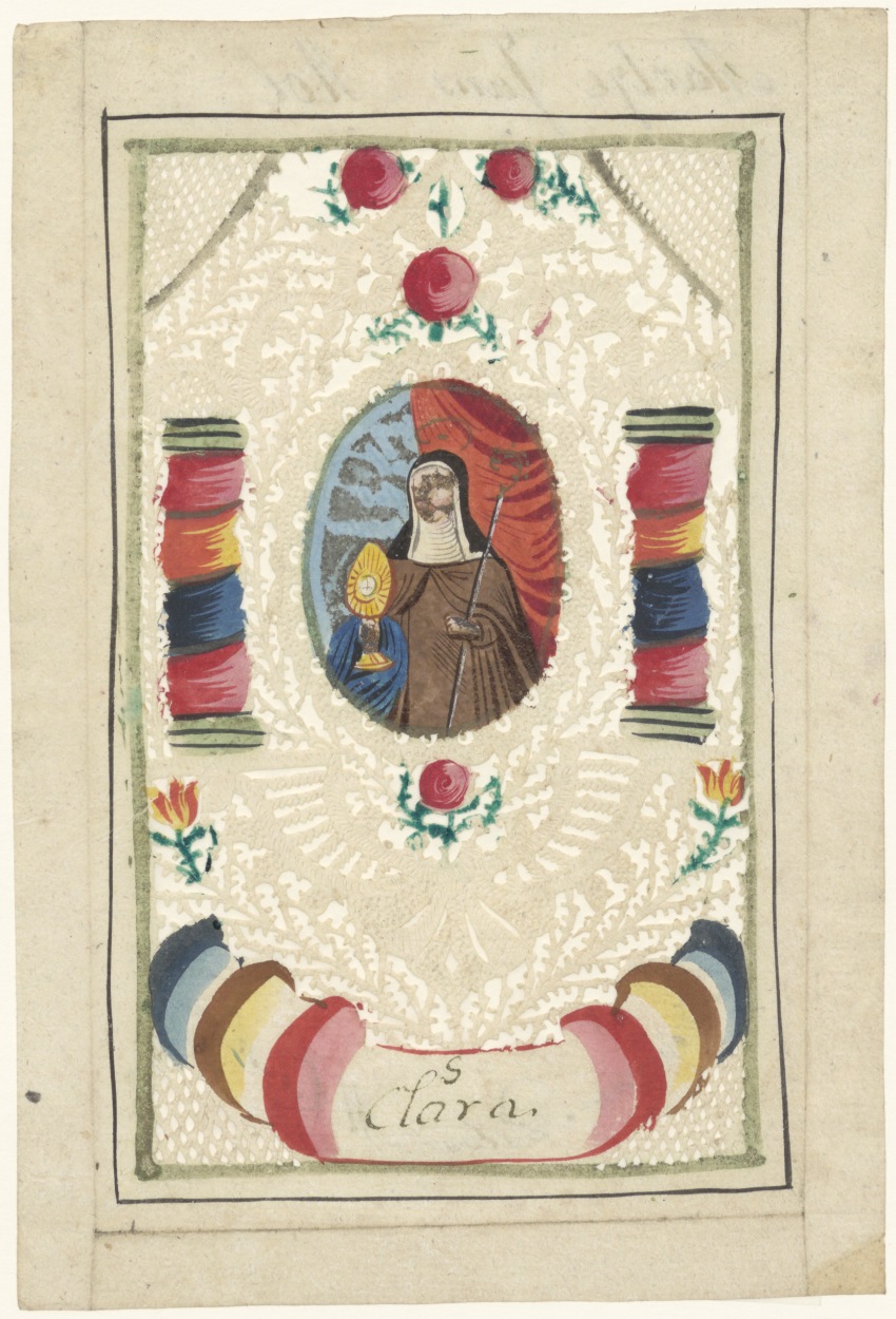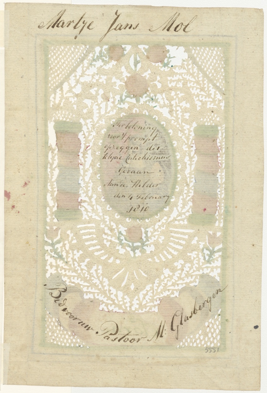 H. Clara, ingekleurd, kz. Beloning Mol, 1810, voor opzeggen catechismus, bid voor uw pastoor M. Glasbergen