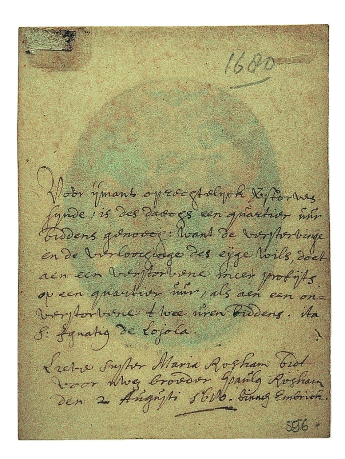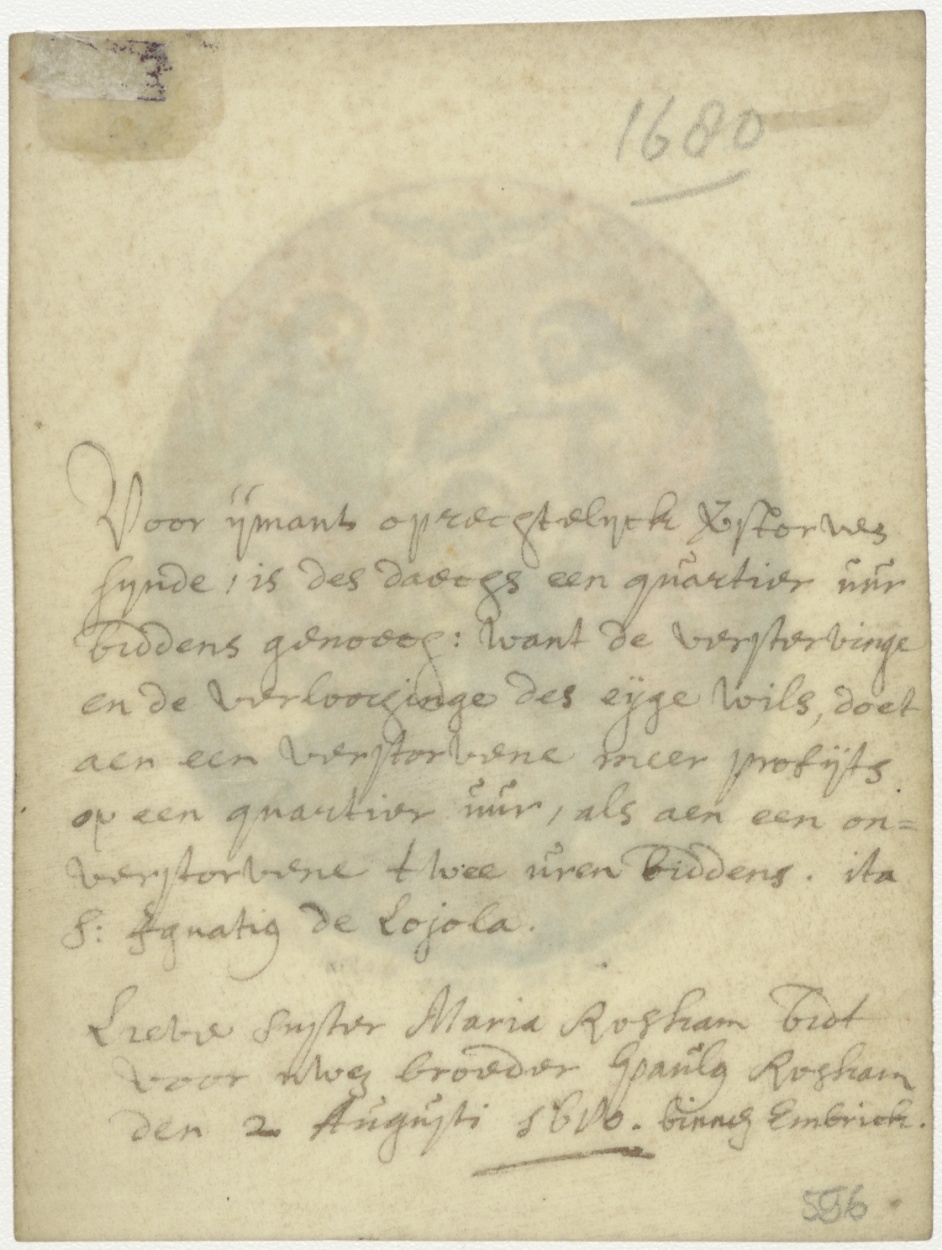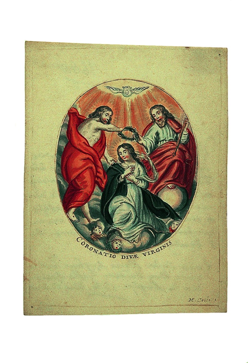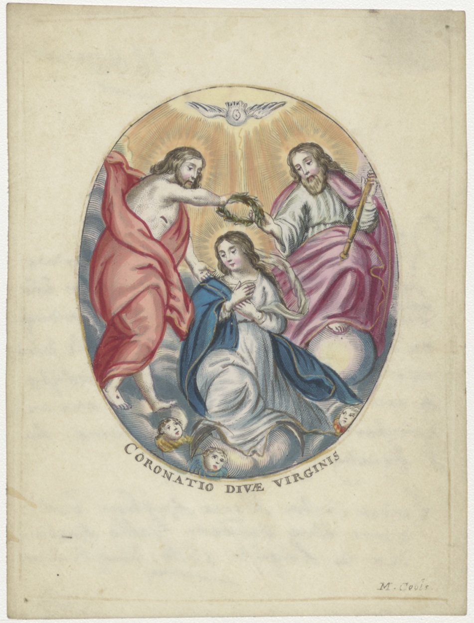Kroning van Maria, ingekleurd, kz. ... Lieve suster Maria Roskam bidt voor uwen broeder Paulus Roskam den 2 augusti 1680 binnen Embrich