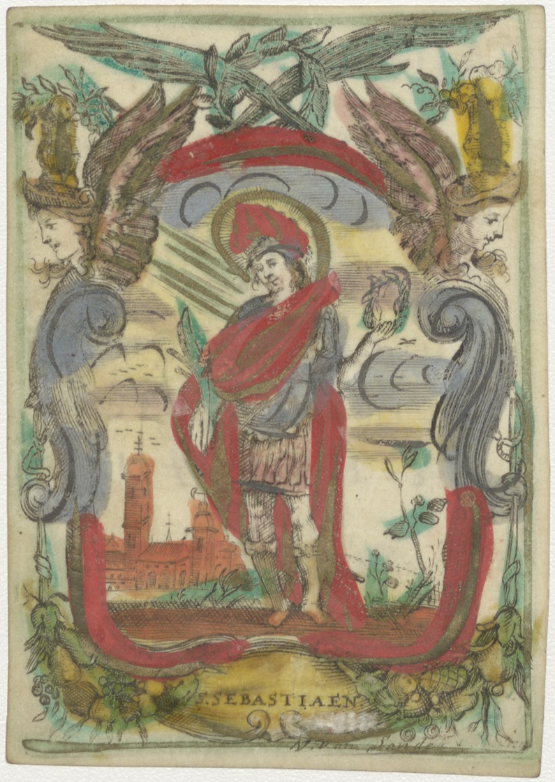 H. Sebastianus, ingekleurd, kz. Religieus; bijbeltekst, bid voor H.T.P.