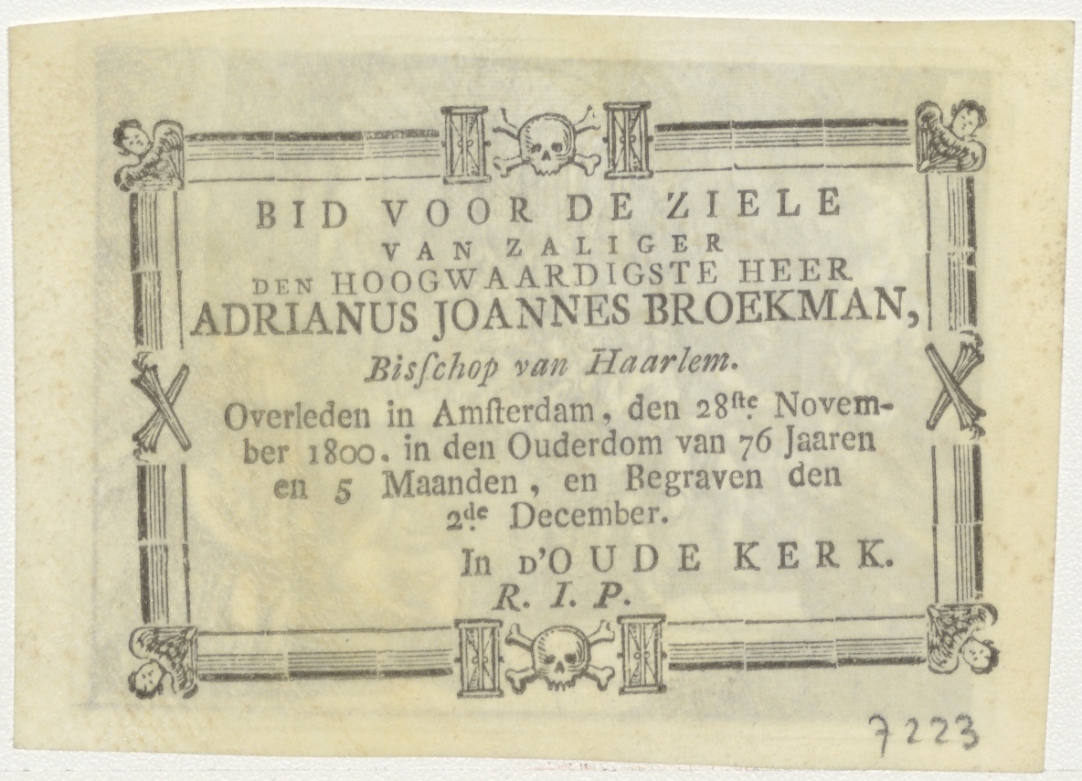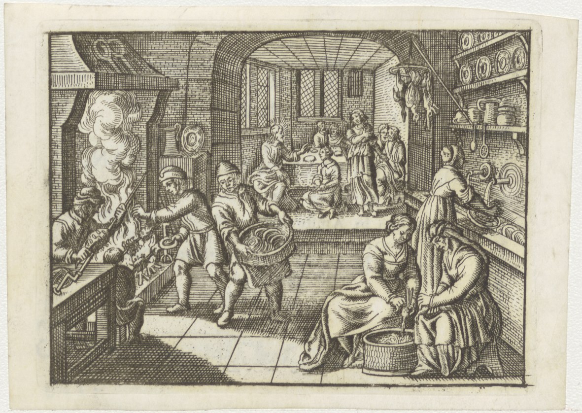 Christus sprekend aan een maaltijd met keukenscène, kz. Religieus bid voor ziel Adrianus Broekman (+1800) Bisschop van Haarlem, overleden te Amsterdam