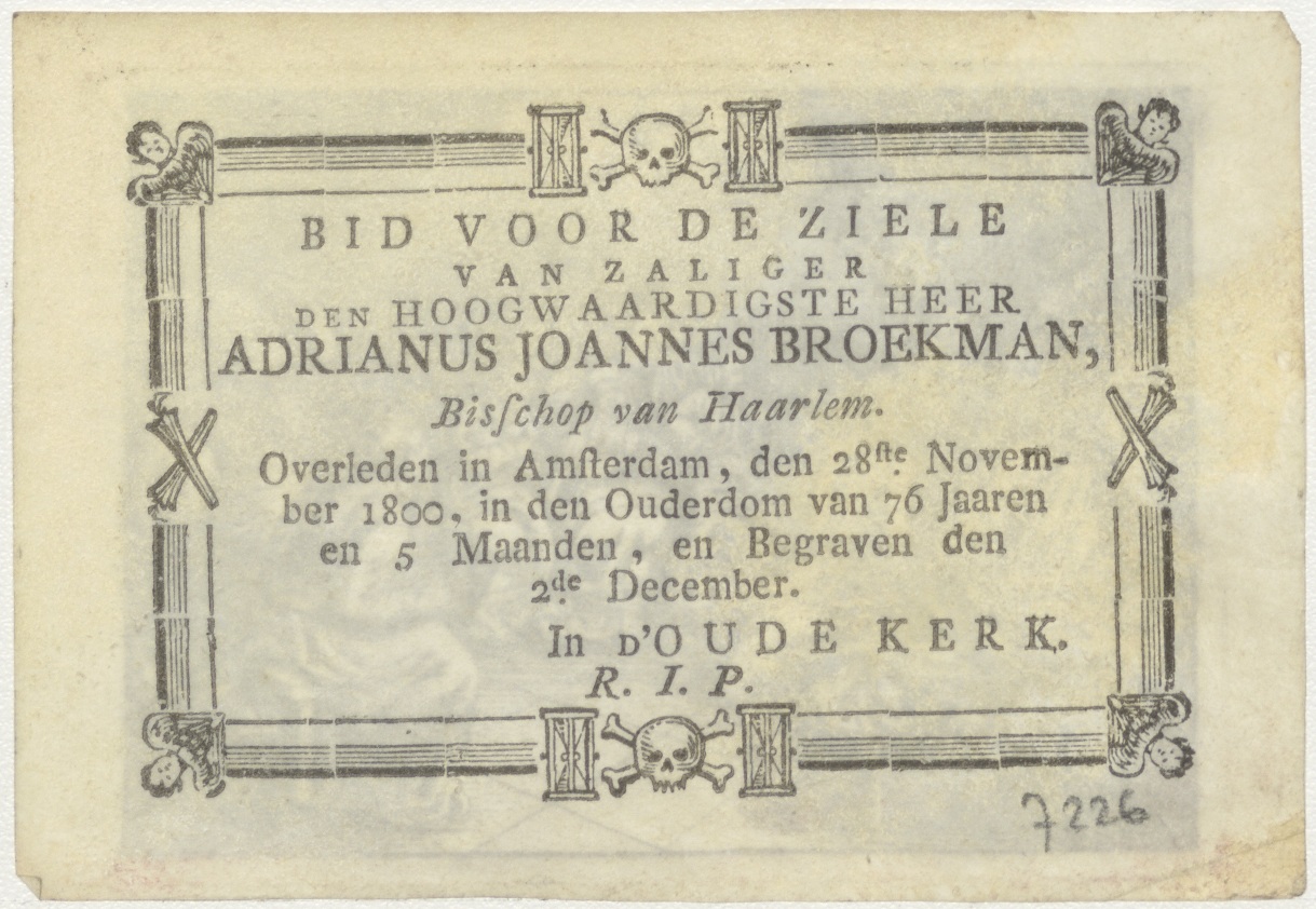 Pinksteren, kz. Religieus bid voor ziel Adrianus Broekman (+1800) Bisschop van Haarlem, overleden te Amsterdam
