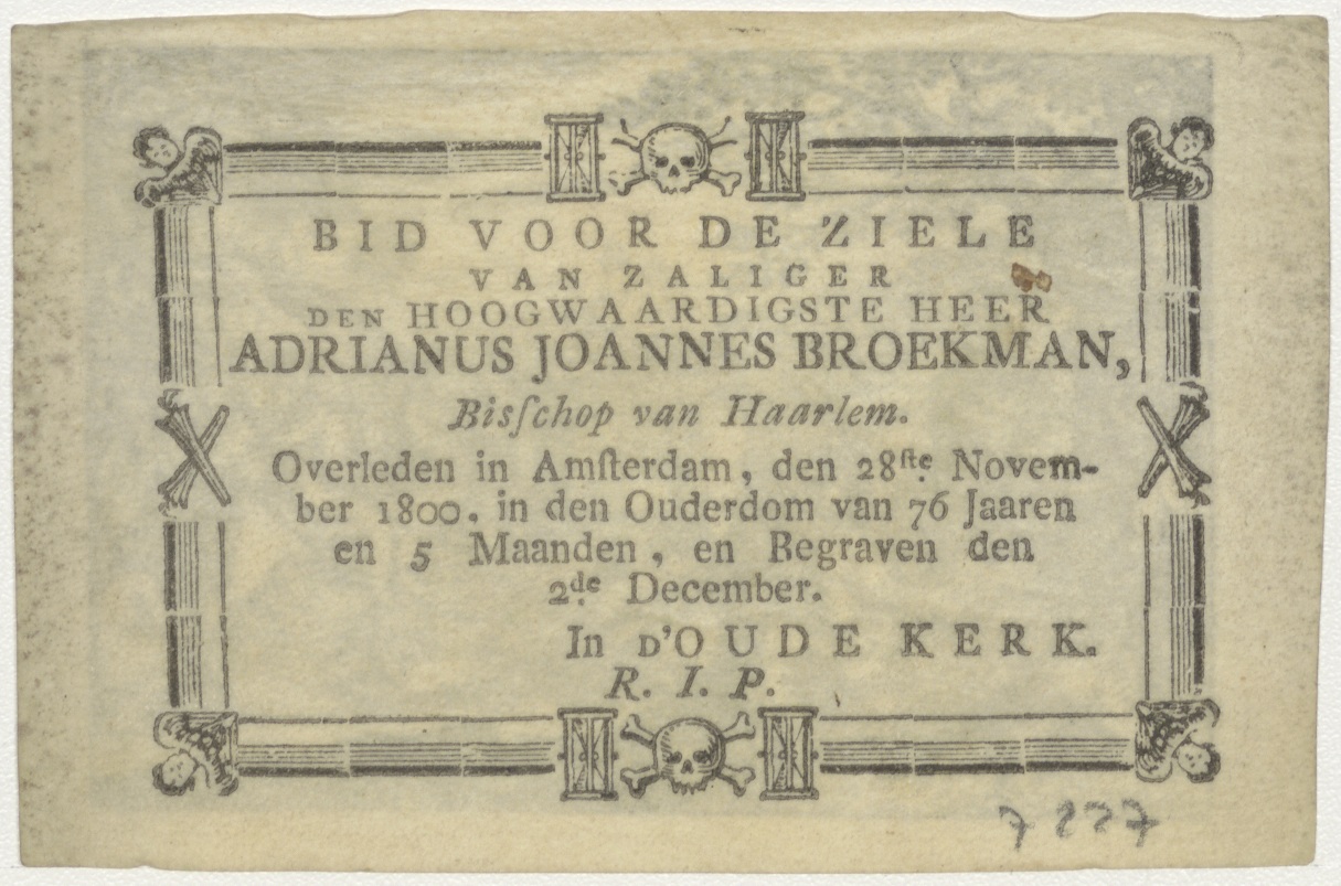 Palmzondag, intocht van Christus in Jeruzalem, kz. Religieus bid voor ziel Adrianus Broekman (+1800) Bisschop van Haarlem, overleden te Amsterdam