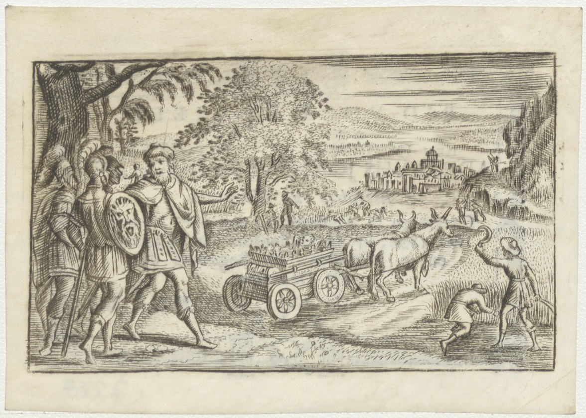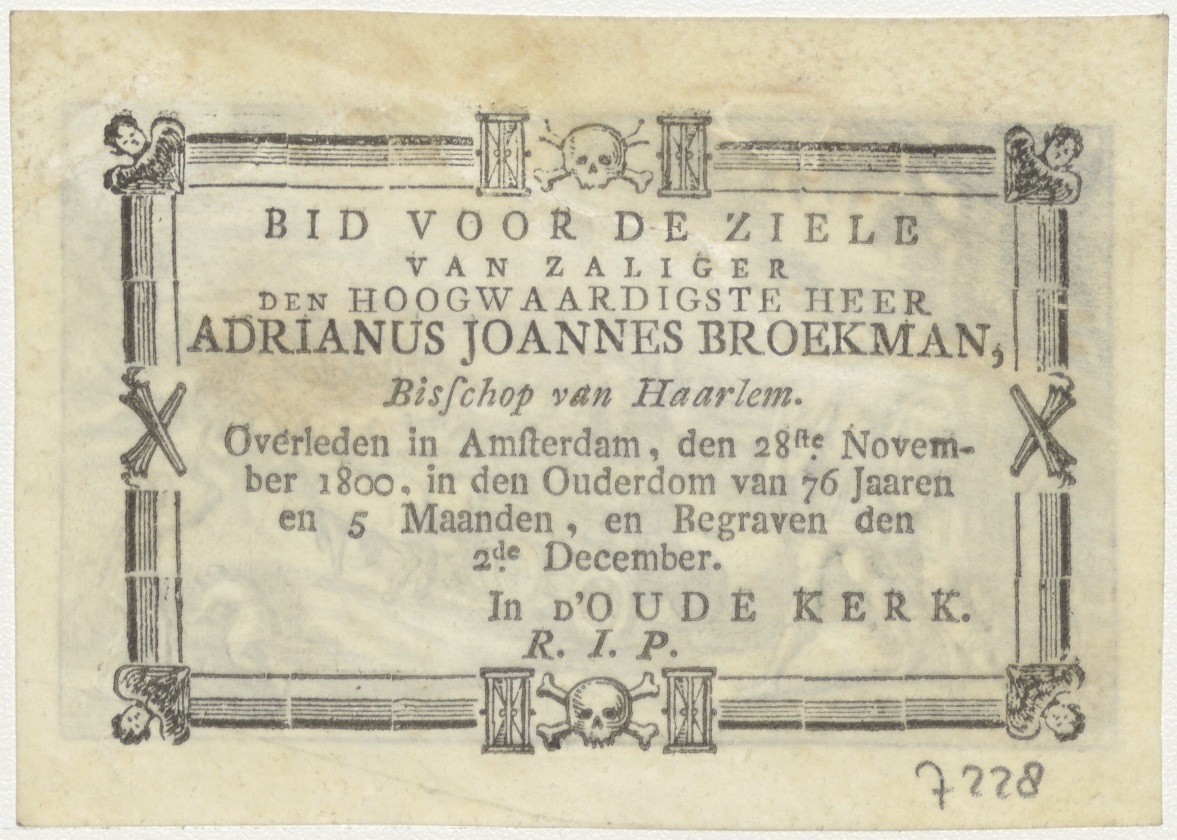 Gouden kalf(?) op ossenkar, kz. Religieus bid voor ziel Adrianus Broekman (+1800) Bisschop van Haarlem, overleden te Amsterdam