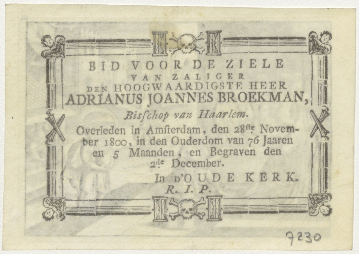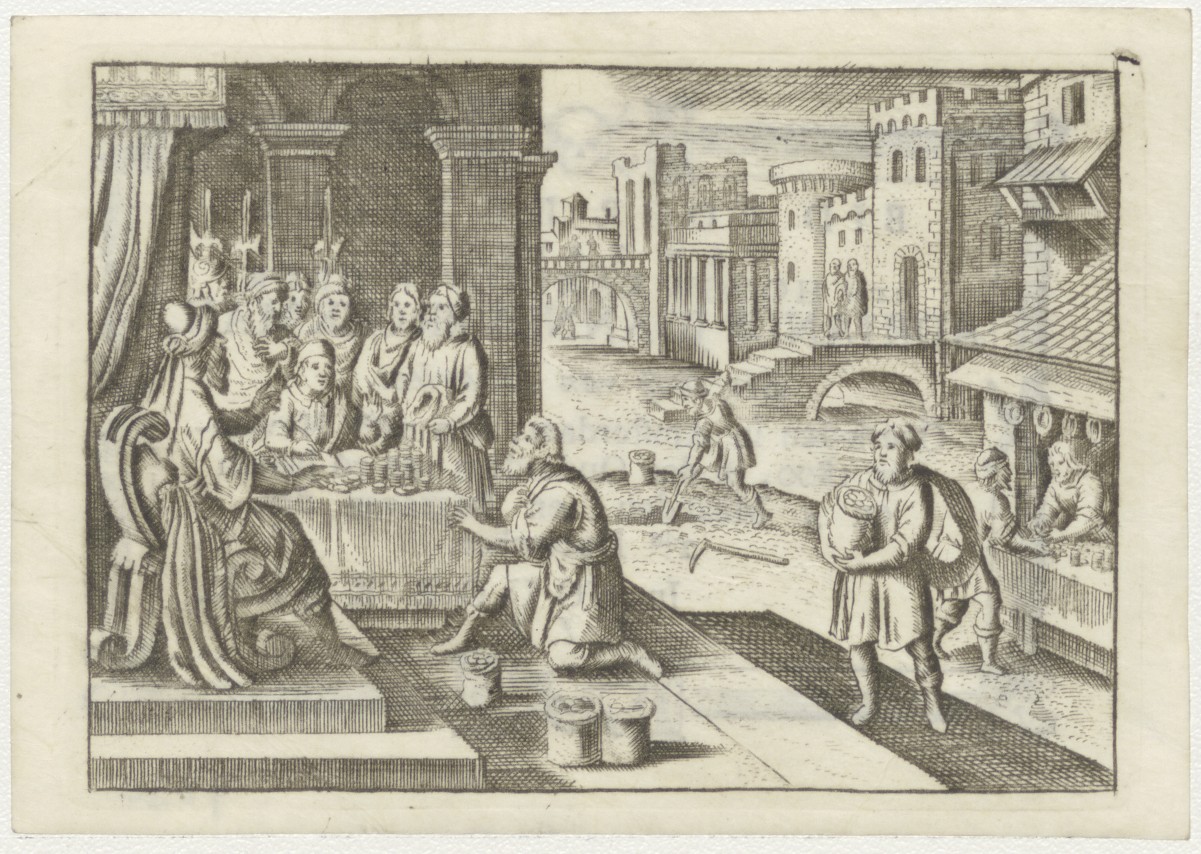 Bijbelse scène met geldwisselaars met arme man(?), kz. Religieus bid voor ziel Adrianus Broekman (+1800) Bisschop van Haarlem, overleden te Amsterdam