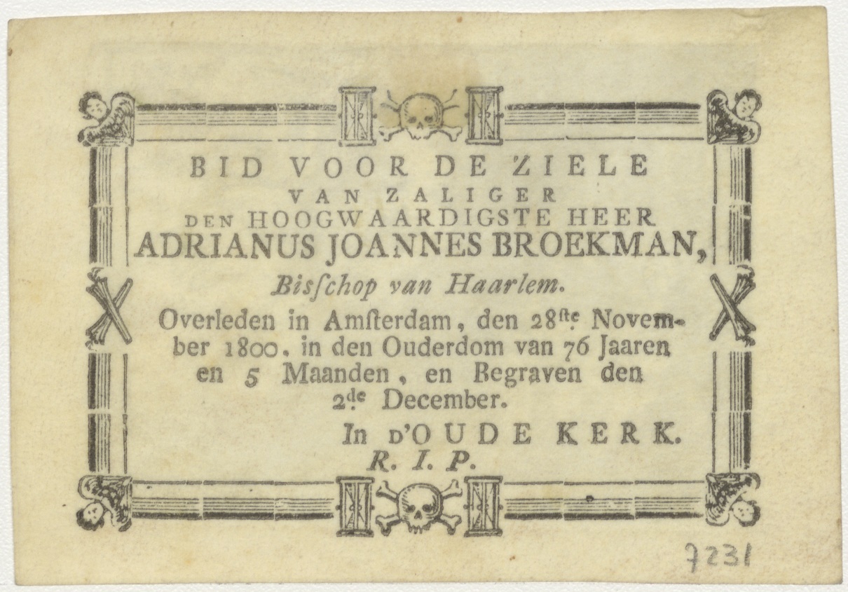 Annunciatie, kz. Religieus bid voor ziel Adrianus Broekman (+1800) Bisschop van Haarlem, overleden te Amsterdam