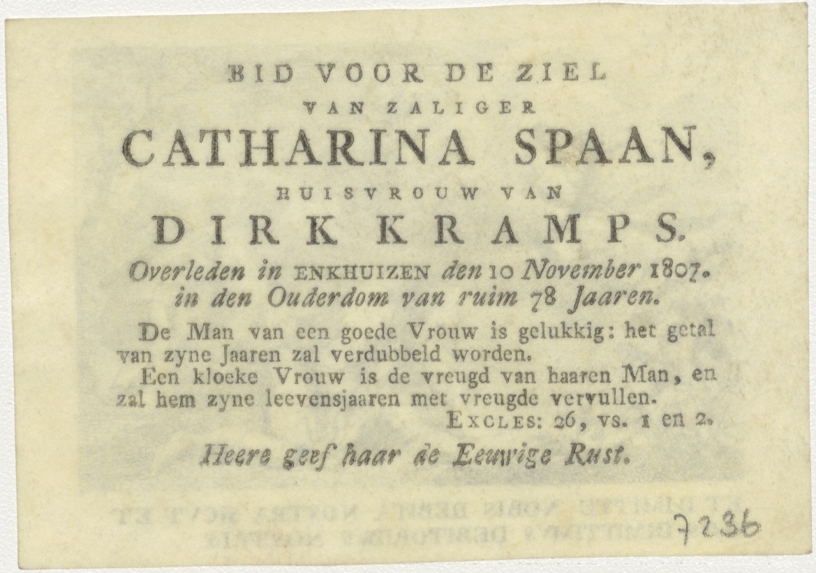 Vergeef ons onze schulden... deel Onze Vader, kz. Bid voor ziel Spaan-Kramps (+1807) Enkhuizen