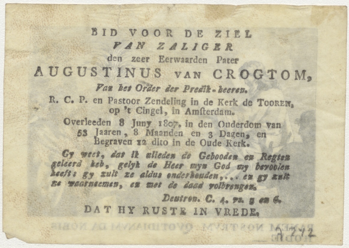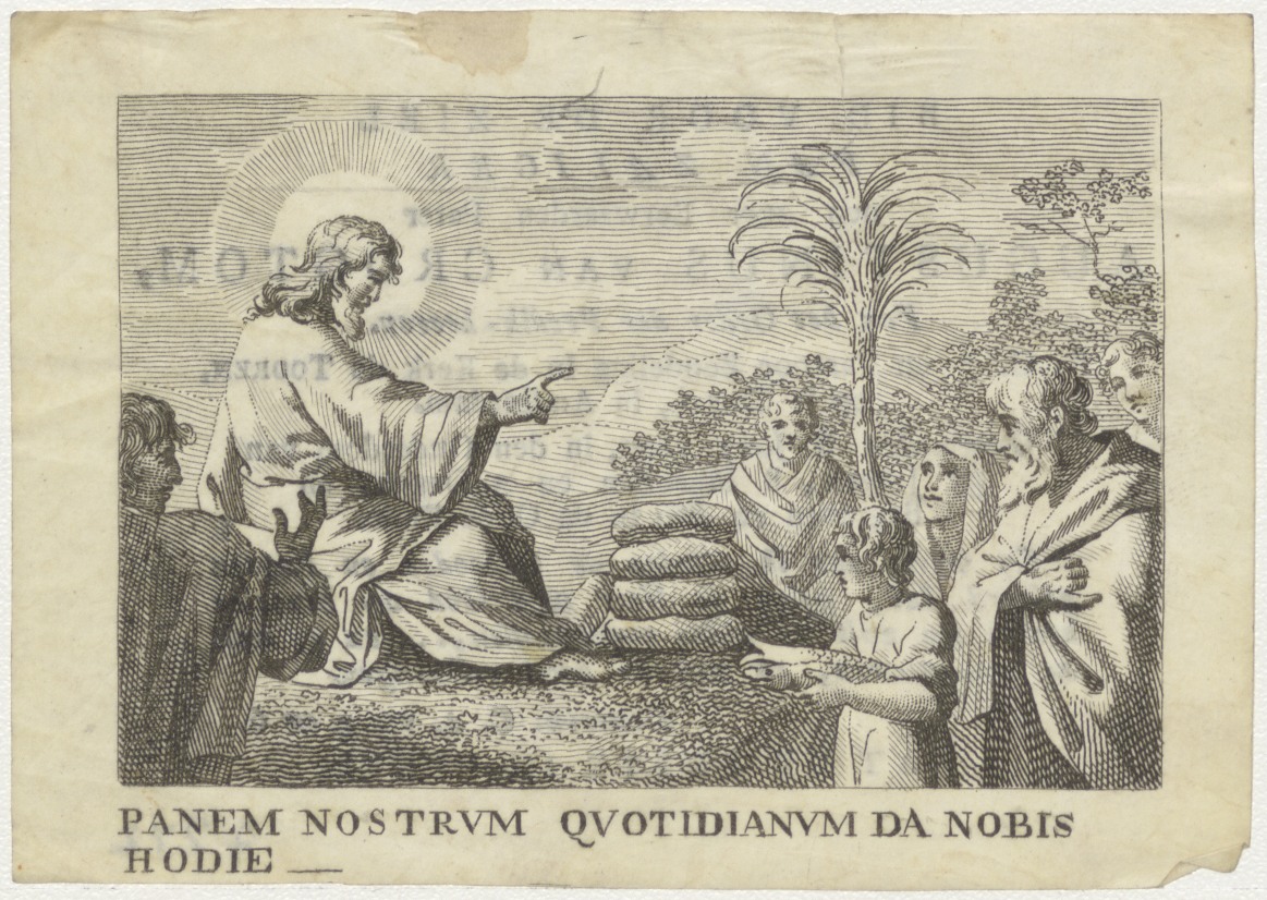 Wonder van Christus: wonderbaarlijke broodvermenigvuldiging, kz. Religieus; bid voor ziel Augustinus van Crogtom (+1807) pastoor predikheren Amsterdam