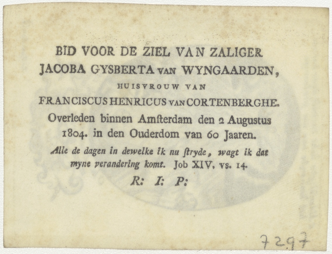 H. Geest (serie): Fructus Gaudij (9), kz. Bid voor ziel Cortenberghe-Wijngaarden (+1804), Amsterdam