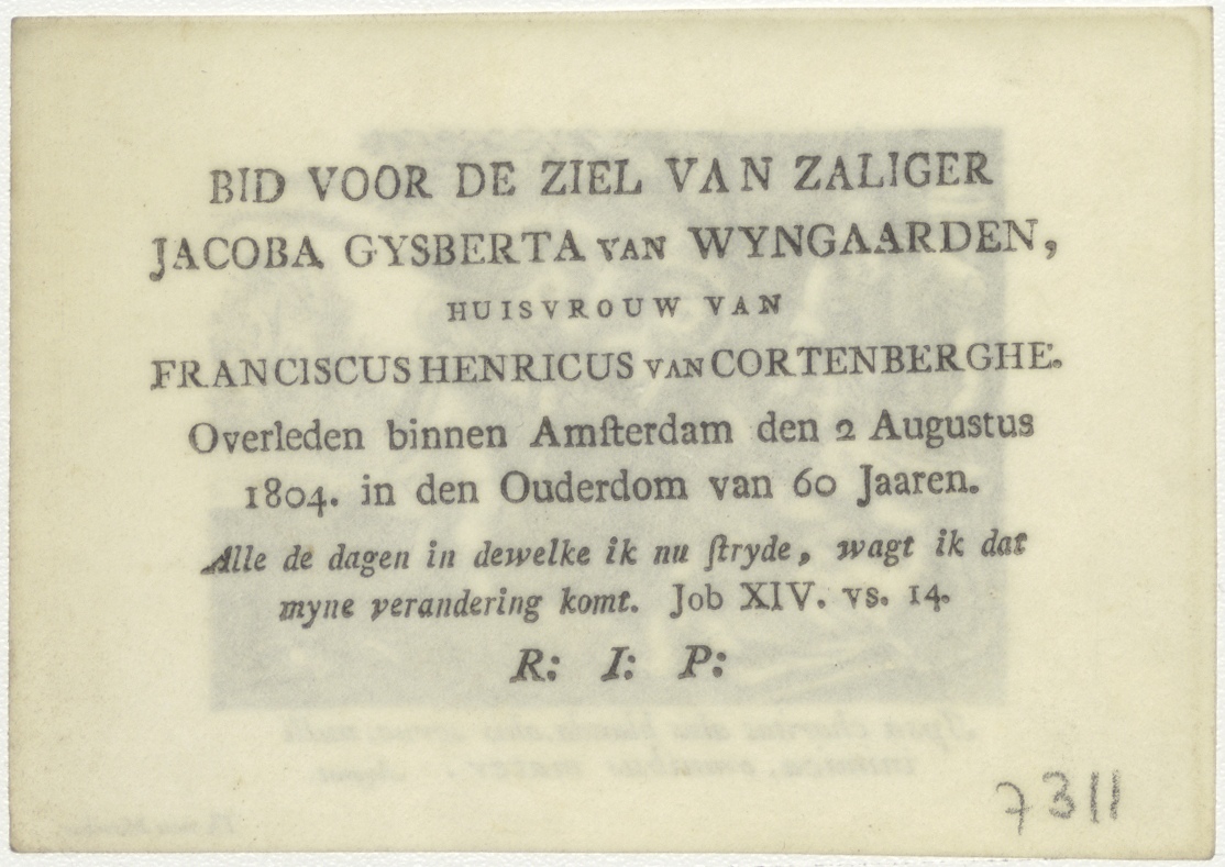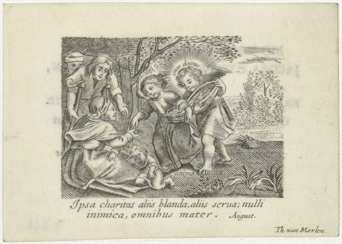 Amor divinus en Anima, geven geld aan behoeftigen, kz. Bid voor ziel Van Wijngaarden-van Cortenberghe (+1804)
