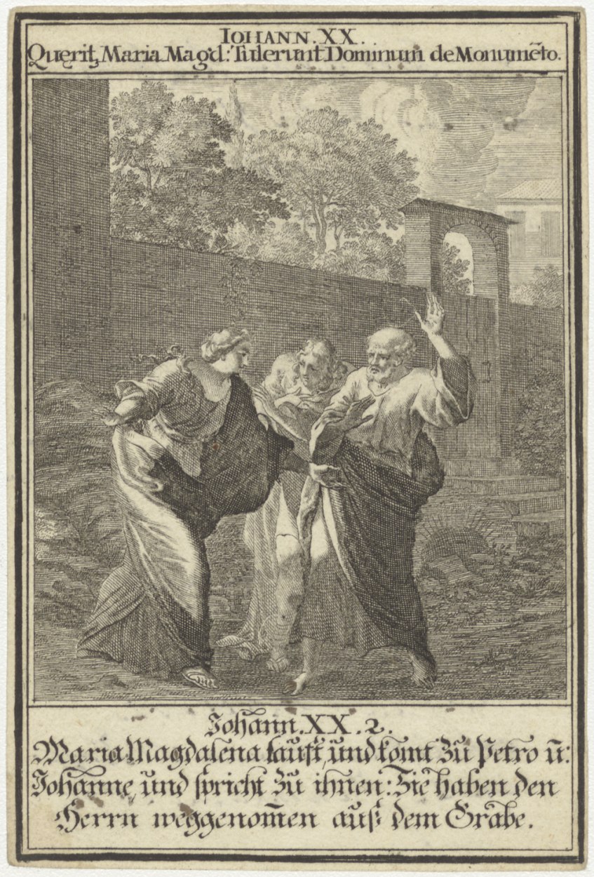 Maria Magdalena vertelt aan Petrus en Johannes dat het lichaam van Christus uit graf is verdwenen, kz. Bid voor ziel Everardus (+1806) Den Haag