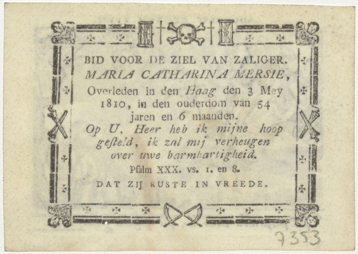 Onze Vader die in de hemelen zijt..., kz. Bid voor ziel Mersie (+1810) Den Haag