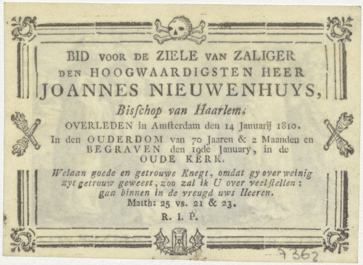 Jezus geneest een blinde, kz. Religieus; bid voor ziel Joannes Nieuwenhuys (+1810) bisschop van Haarlem