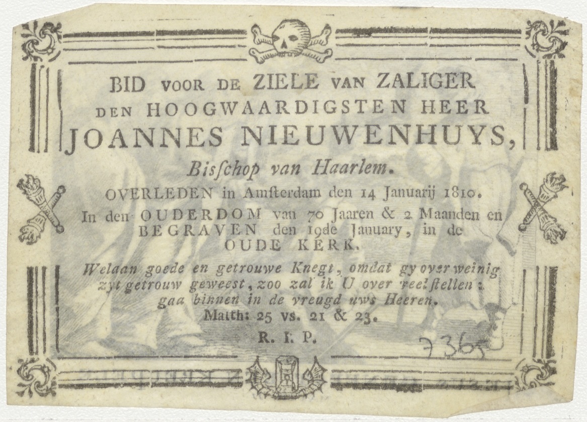 Jezus geneest een kreupele, kz. Religieus; bid voor ziel Joannes Nieuwenhuys (+1810) bisschop van Haarlem