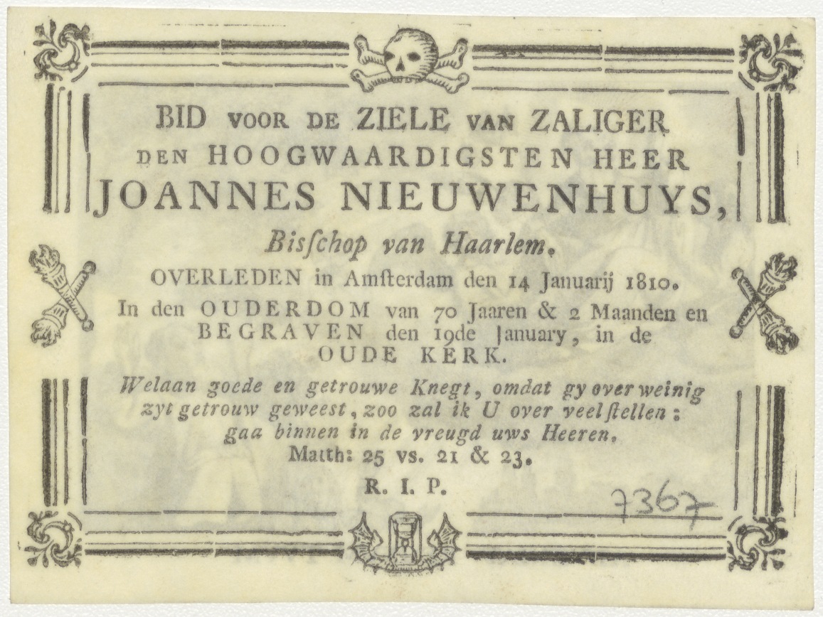 Adveniat regnum Tuum (Uw koninkrijk kome), kz. Religieus; bid voor ziel Joannes Nieuwenhuys (+1810) bisschop van Haarlem