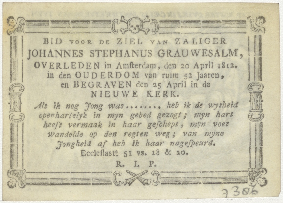 Onze Vader die in de hemelen zijt..., kz. Bid voor ziel Grauwesalm (+1812) Amsterdam