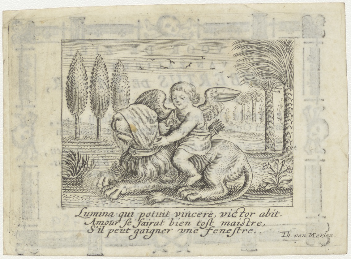 Amor of engel gezeten op leeuw, kz. Bid voor ziel De Jager (+1814) Utrecht