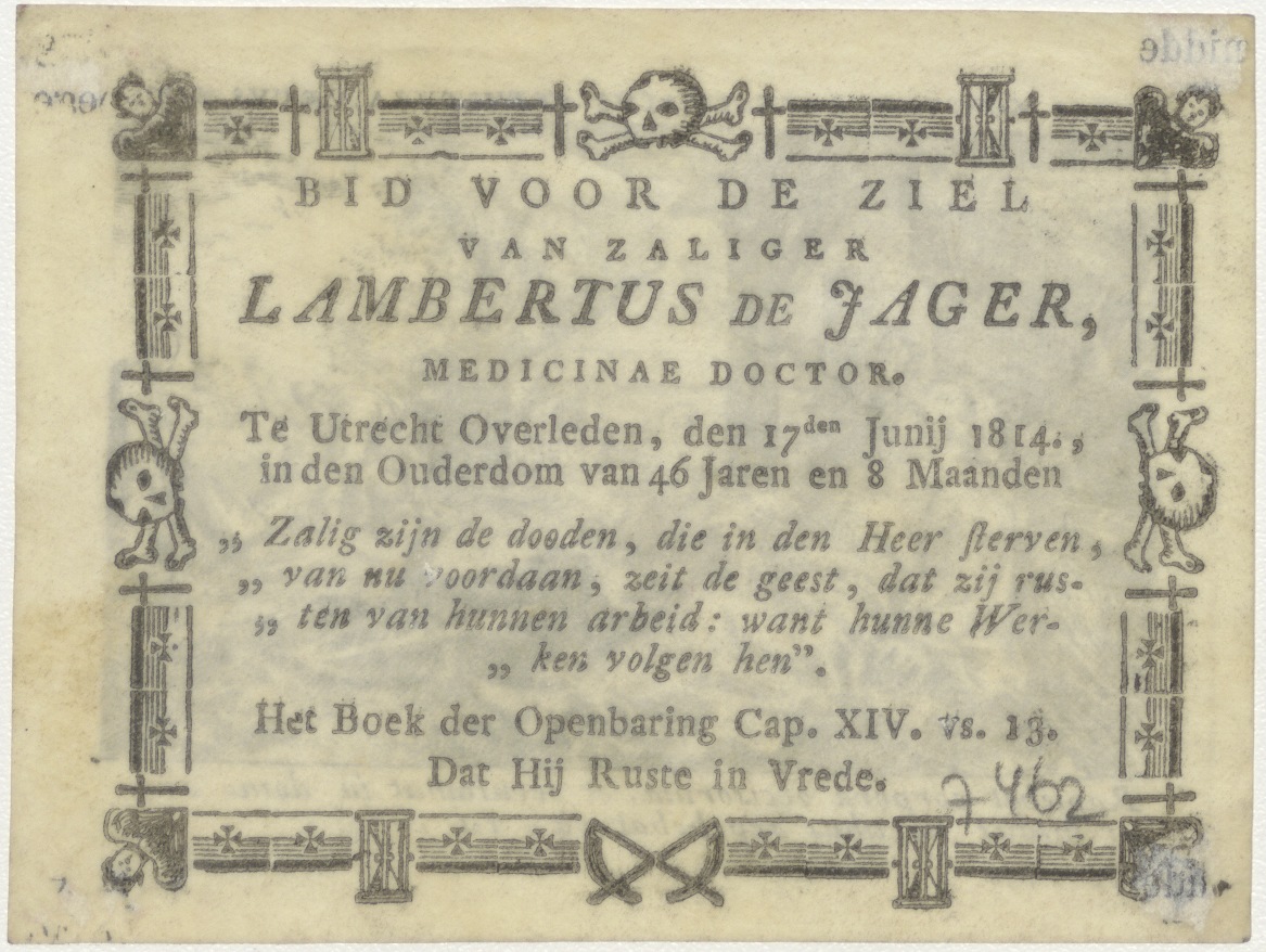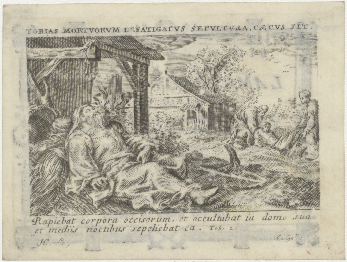 Tobias wordt blind, op de achtergrond begraaft hij de dode (Tob. 2), kz. Bid voor ziel De Jager (+1814) Utrecht