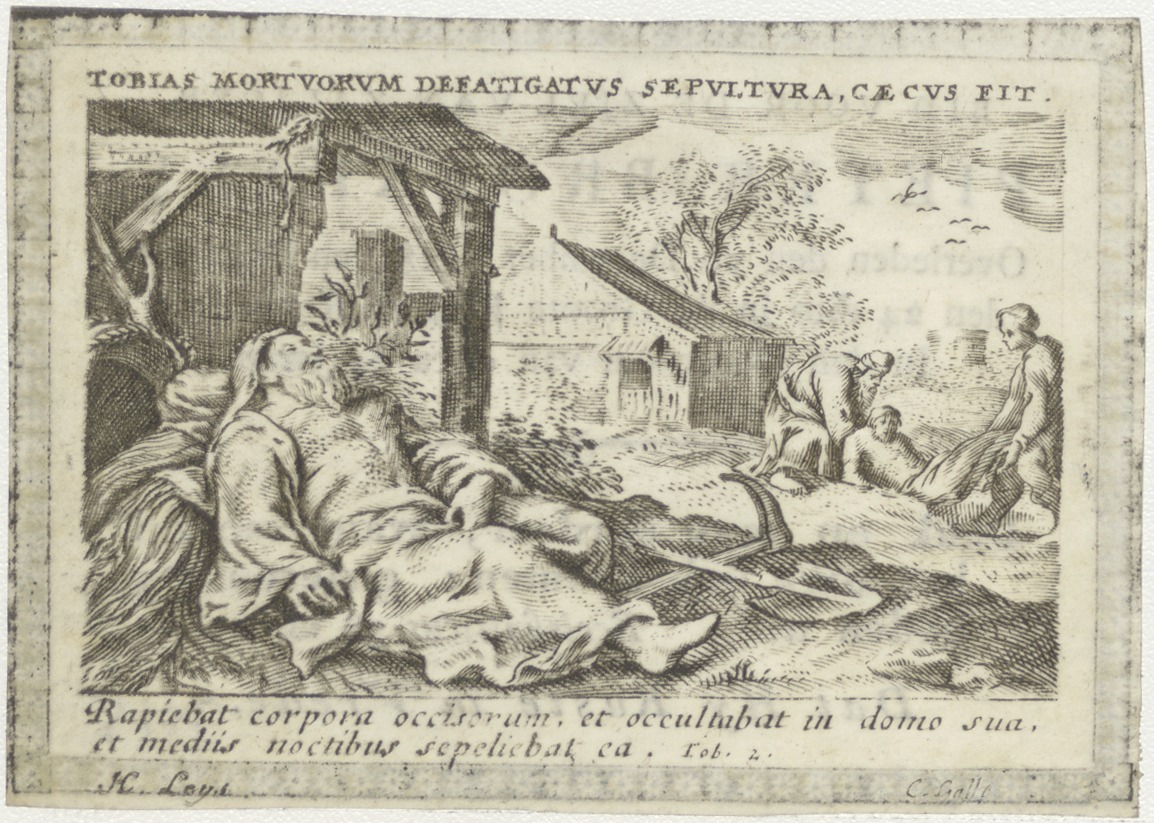 Tobias wordt blind, op de achtergrond begraaft hij de dode (Tob. 2), kz. Bid voor ziel Broeckhals (+1818) Rotterdam