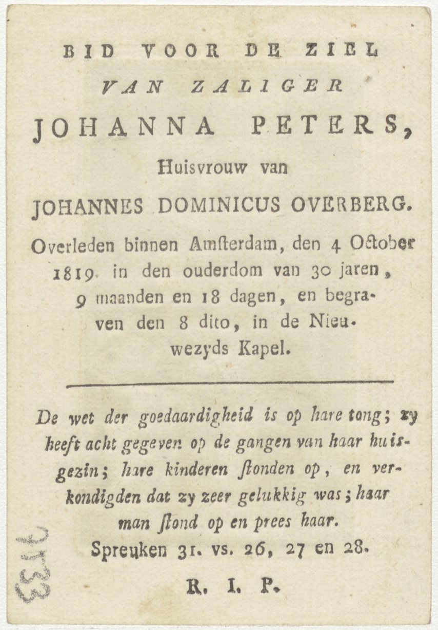 H. Mattheus, kz. Bid voor ziel Peters-Overberg (+1819) Amsterdam
