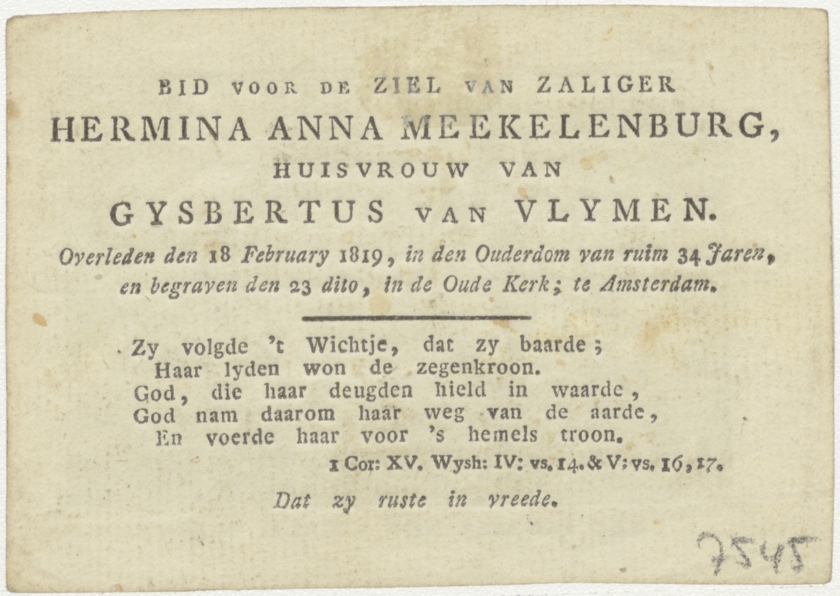 Lijdt ons niet in verzoeking... Onze Vader, kz. Bid voor ziel Van Vlijmen-Meekelenburg (+1819) Amsterdam