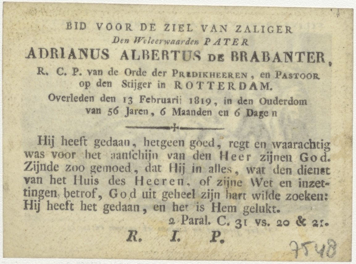 Terugkeer van de verloren zoon, kz. Religieus; bid voor ziel Adrianus de Brabanter (+1819) predikheer, pastoor De Stijger Rotterdam