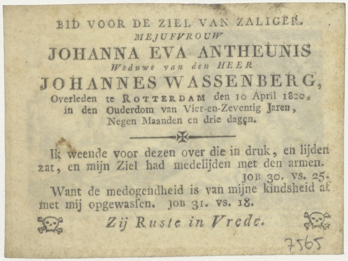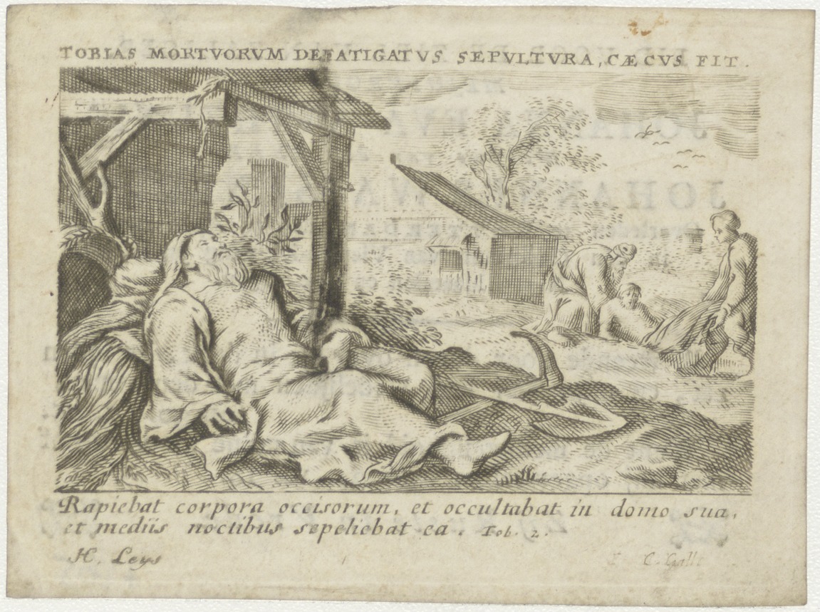 Tobias wordt blind, op de achtergrond begraaft hij de dode (Tob. 2), kz. Bid voor ziel Antheunis Wassenberg (+1820) Rotterdam