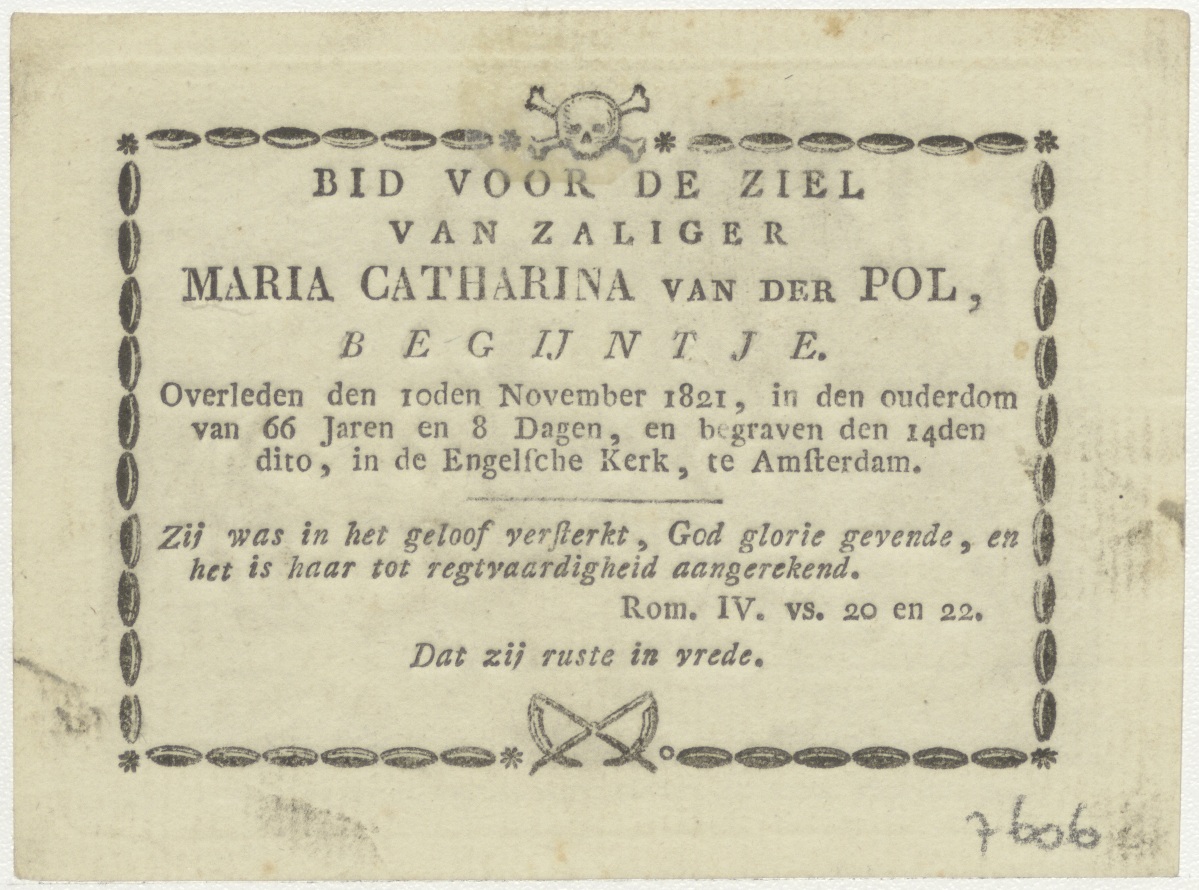 Geboorte van Christus, kz. Religieus; bid voor ziel Maria van der Pol (+1821) begijntje Amsterdam