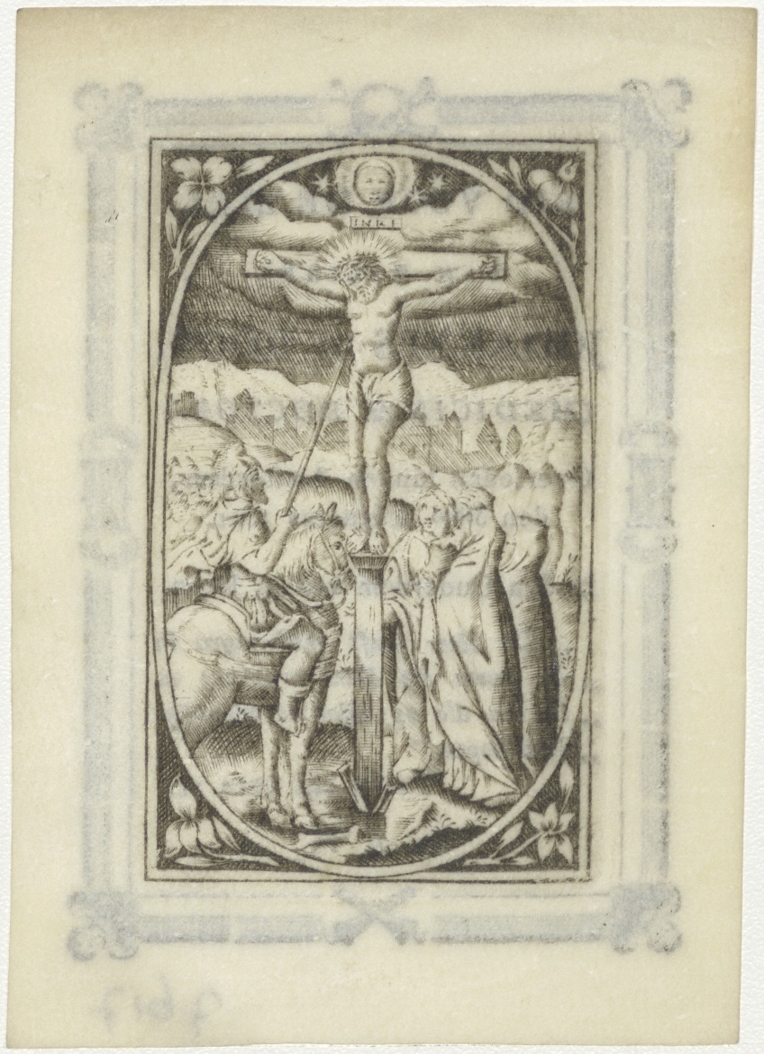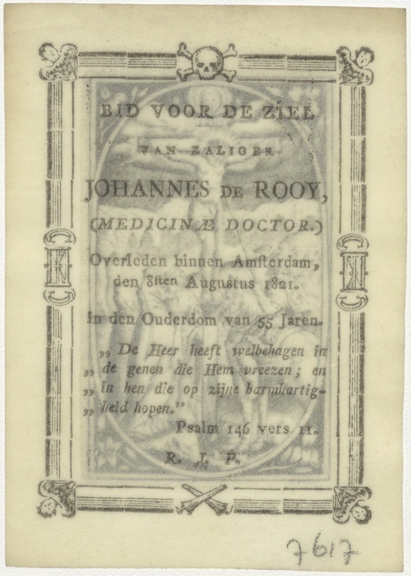 Gekruisigde Christus wordt met lans in zijn zijde gestoken, kz. Bid voor ziel Johannes de Rooy (+1821) Amsterdam