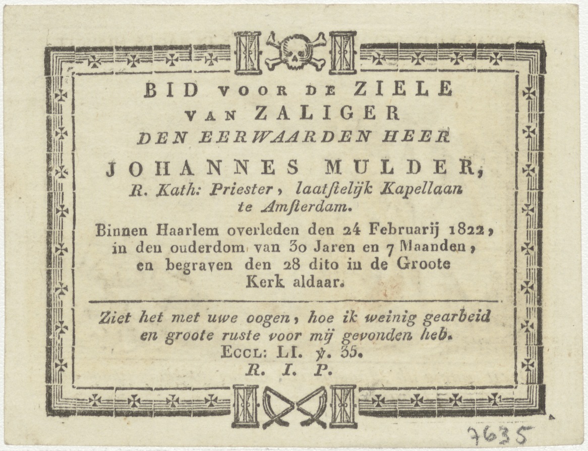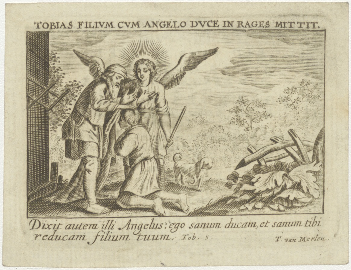 Tobias en de engel zegent jongen (Tob. 5), kz. Religieus; bid voor ziel Johannes Mulder (+1822) Haarlem, priester, kapellaan te Amsterdam