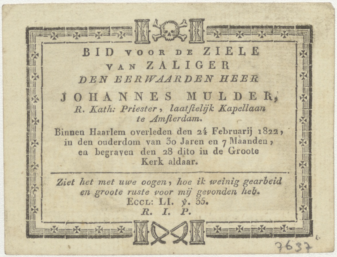 Jesus Christus en Maria, kz. Religieus; bid voor ziel Johannes Mulder (+1822) Haarlem, priester, kapellaan te Amsterdam