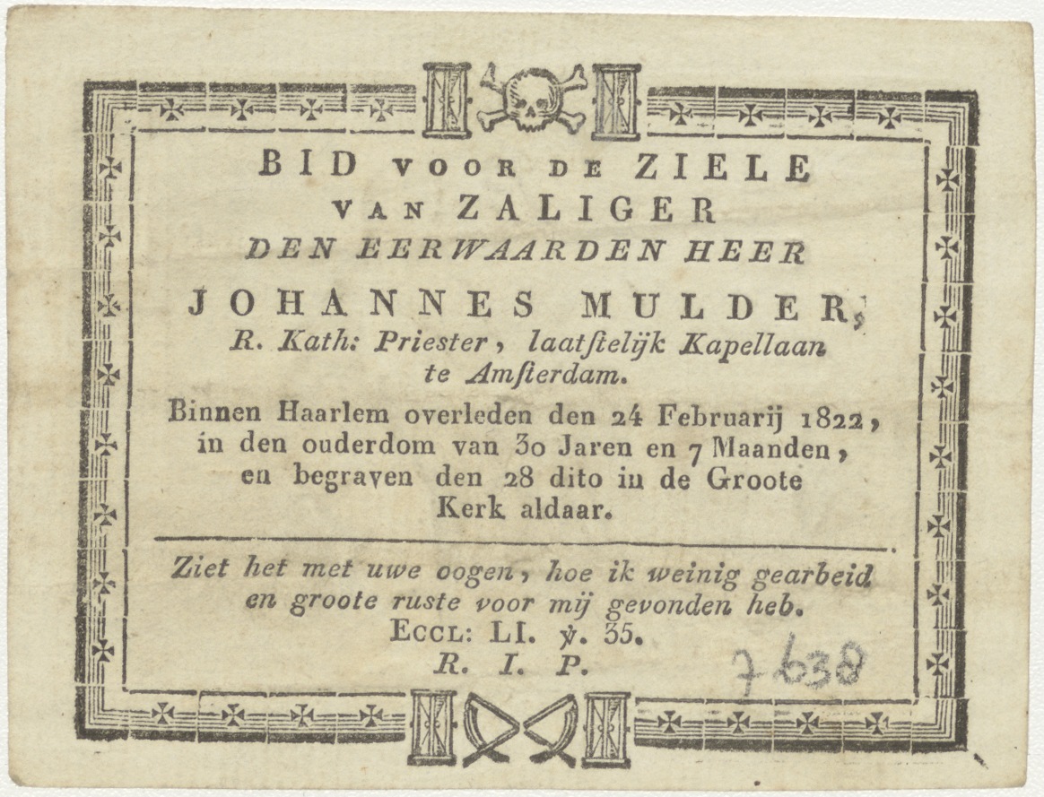 Visitatie, kz. Religieus; bid voor ziel Johannes Mulder (+1822) Haarlem, priester, kapellaan te Amsterdam