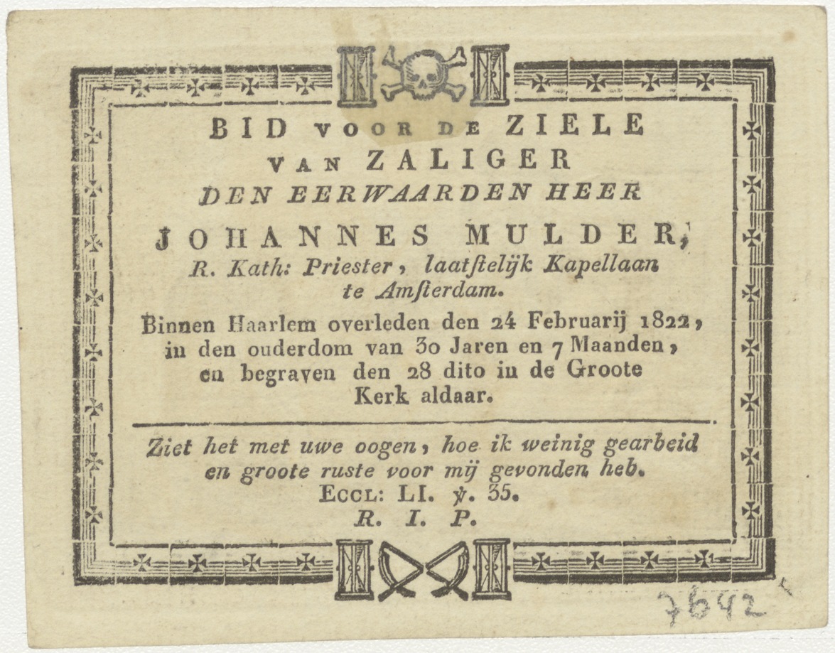 Maria met Christuskind, kz. Religieus; bid voor ziel Johannes Mulder (+1822) Haarlem, priester, kapellaan te Amsterdam