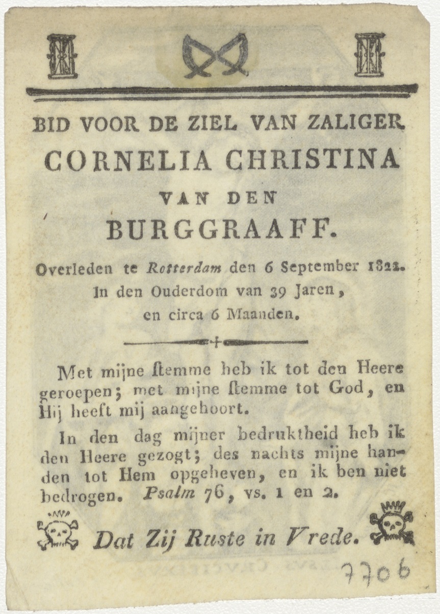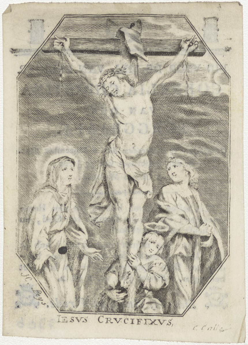 Gekruisigde Christus met Maria, Maria Magdalena en Johannes, kz. Bid voor ziel Van den Burggraaff (+1822) Rotterdam