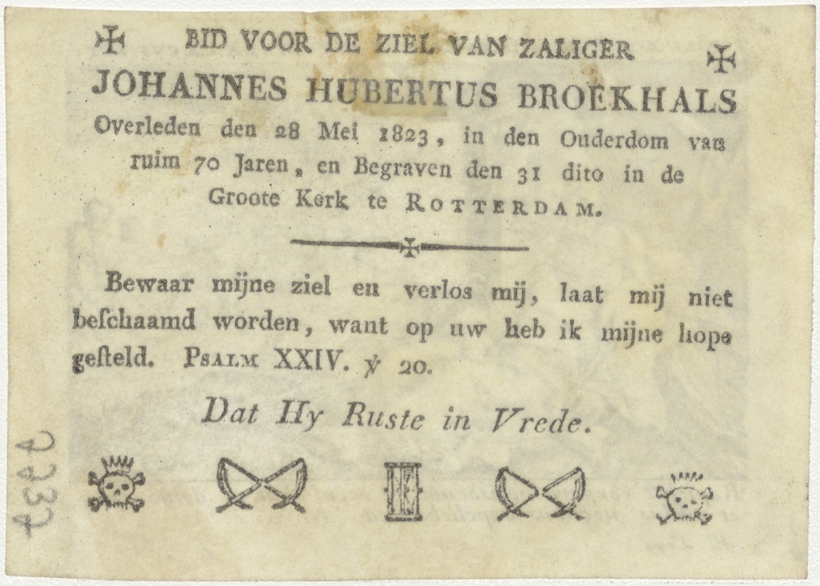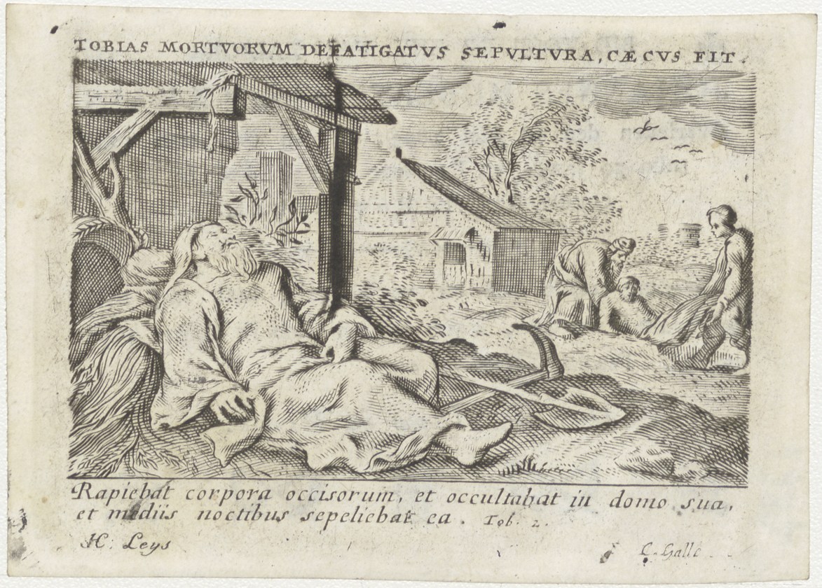 Tobias wordt blind, op de achtergrond begraaft hij de dode (Tob. 2), kz. Bid voor ziel Broekhals (+1823) Rotterdam
