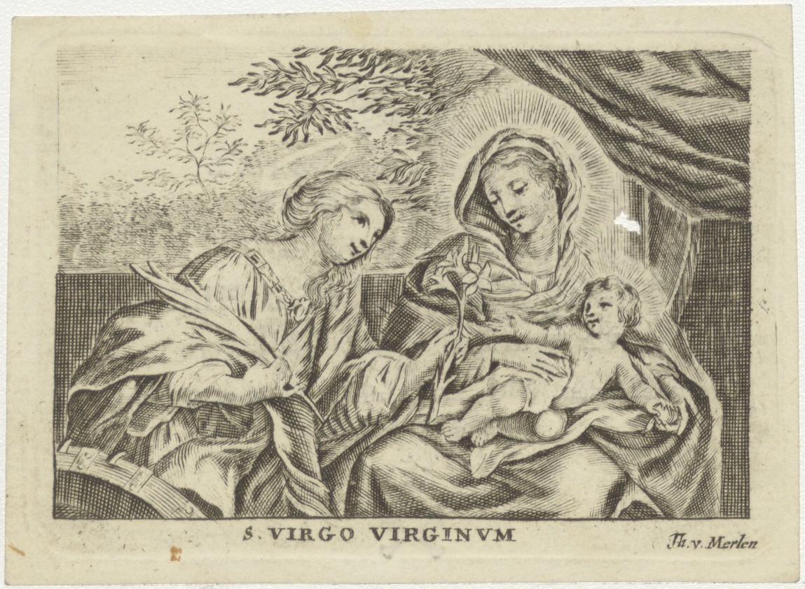 Maria met Christuskind en vrouwelijke heilige, kz. Bid voor ziel Van der Veecken (+1824)