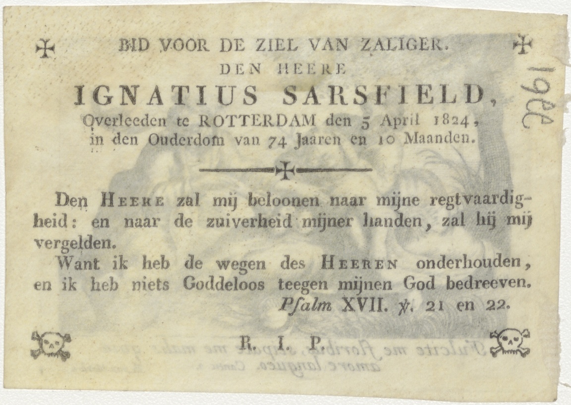 Allegorie met drie vrouwen, kz. Bid voor ziel Sarsfield (+1824) Rotterdam