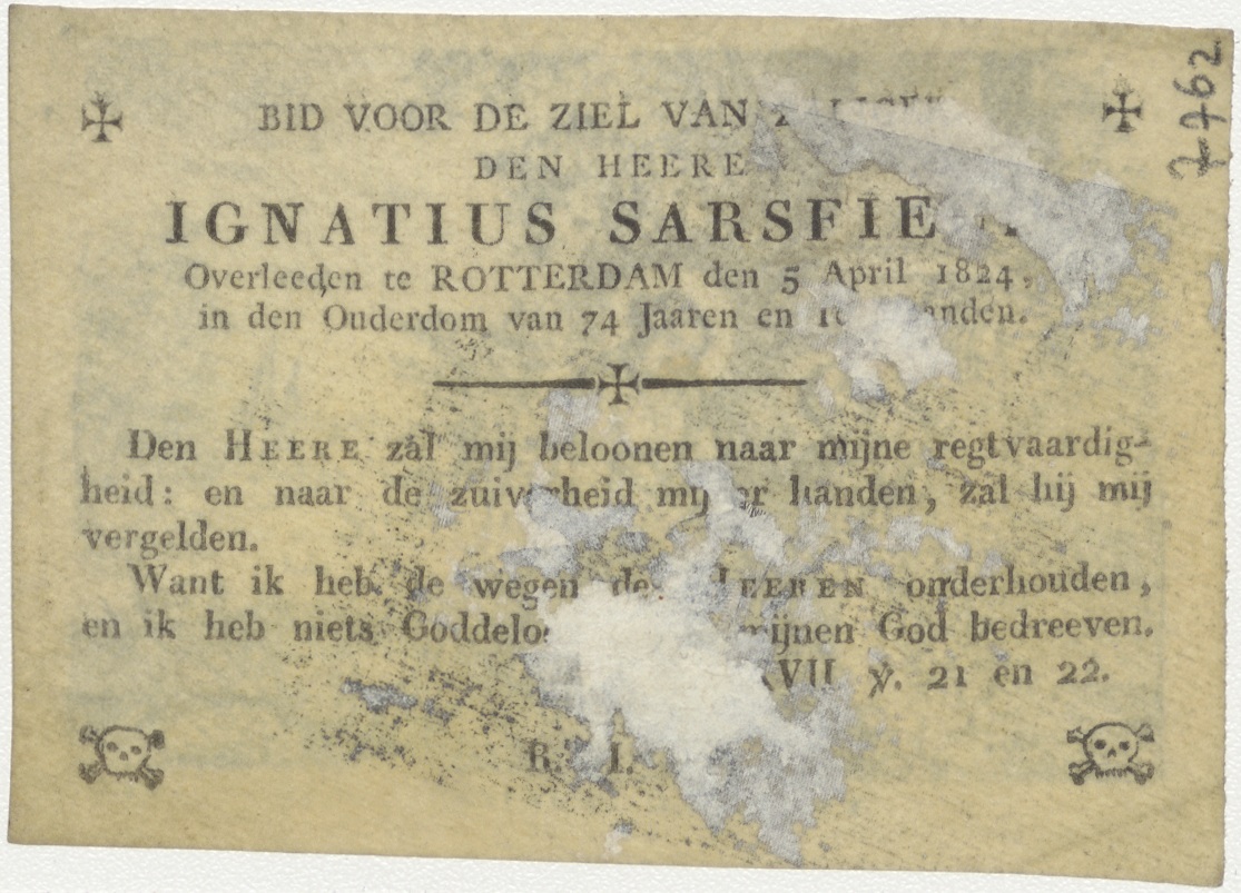 Maria met Christuskind, kz. Bid voor ziel Sarsfield (+1824) Rotterdam