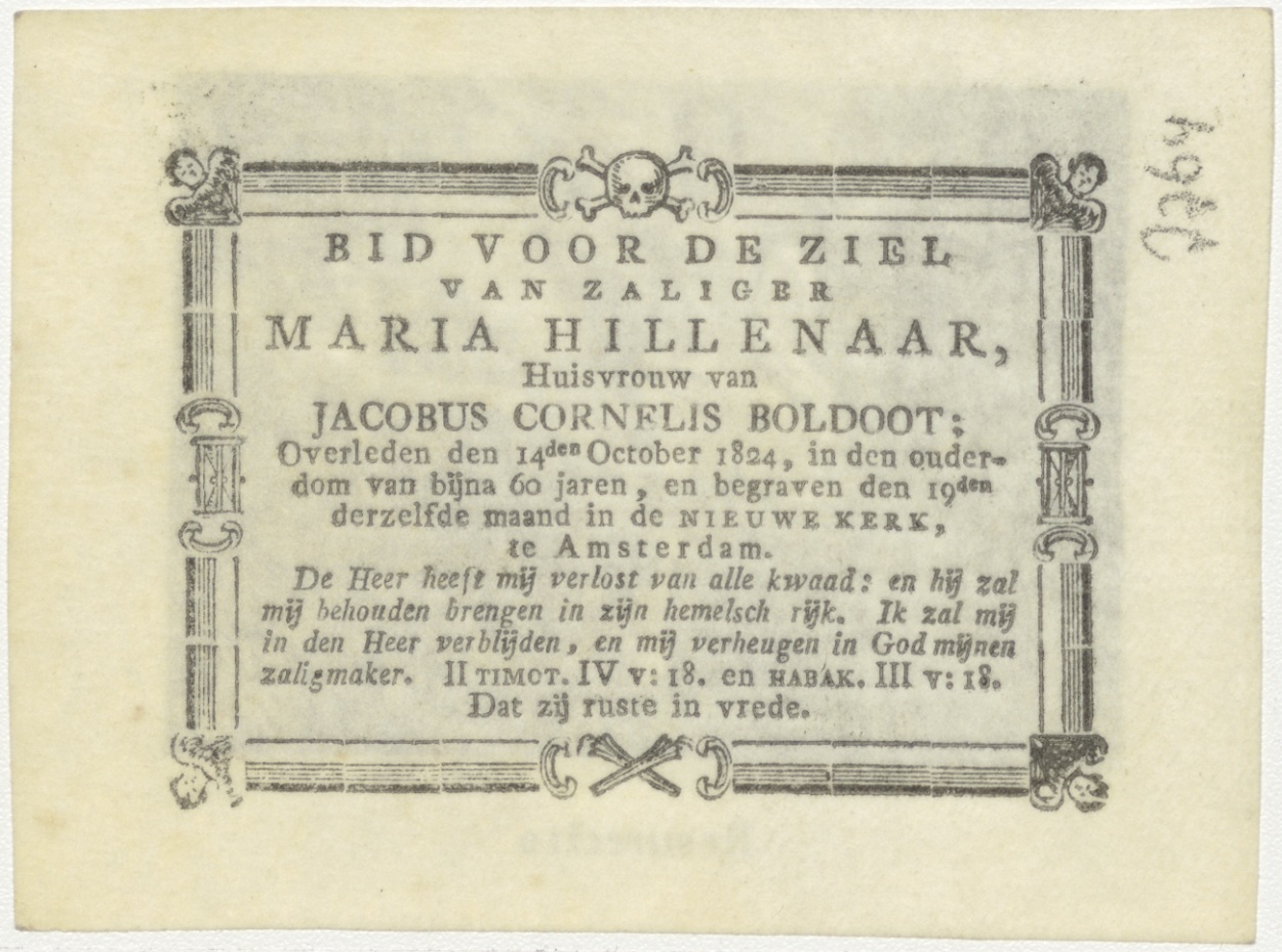 Verrijzenis van Christus, kz. Bid voor ziel Maria Hillenaar (+1824) Amsterdam, huisvrouw van Jacobus Cornelis Boldoot