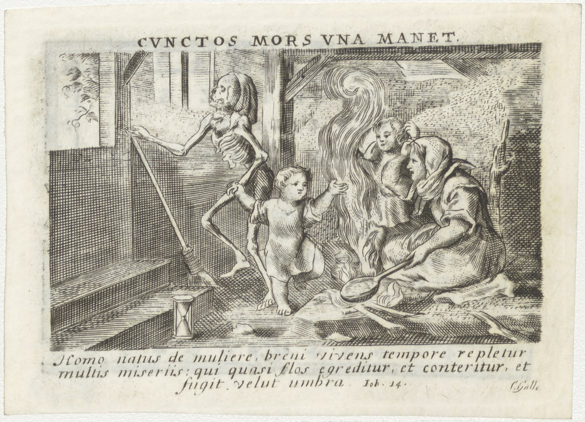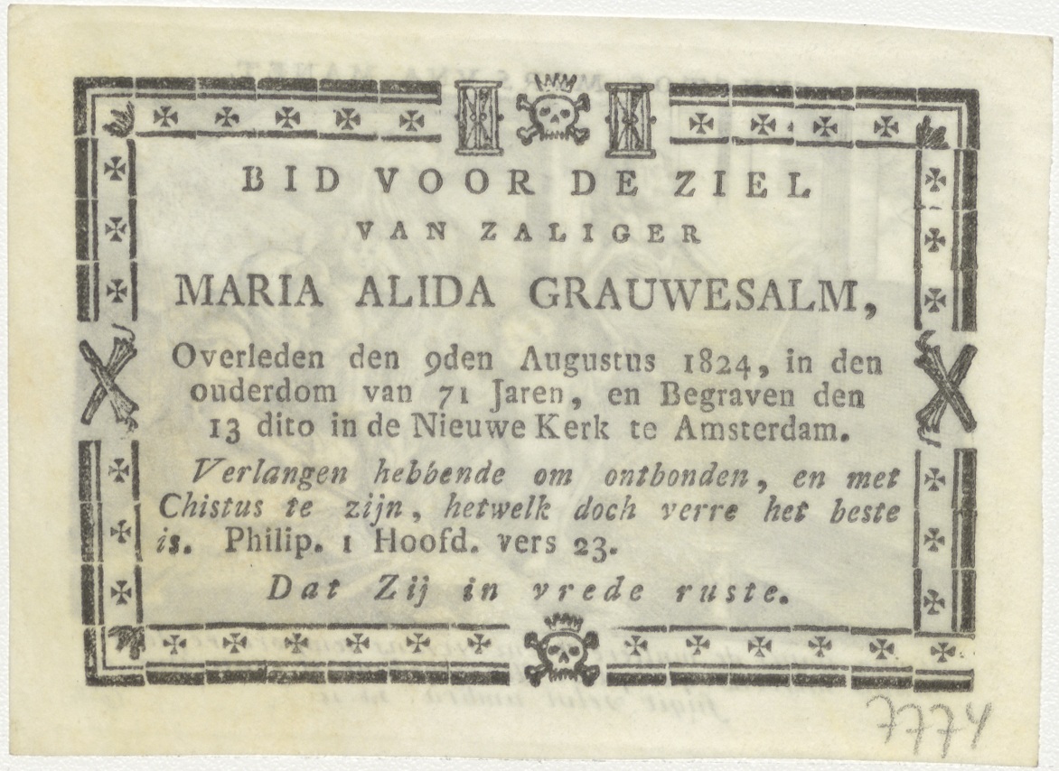 Kind wordt door de dood weggevoerd (Job. 14), kz. Bid voor ziel Grauwesalm (+1824) Amsterdam