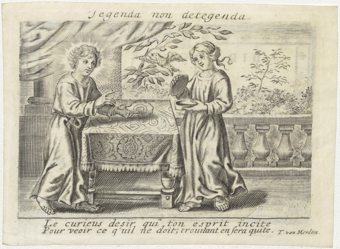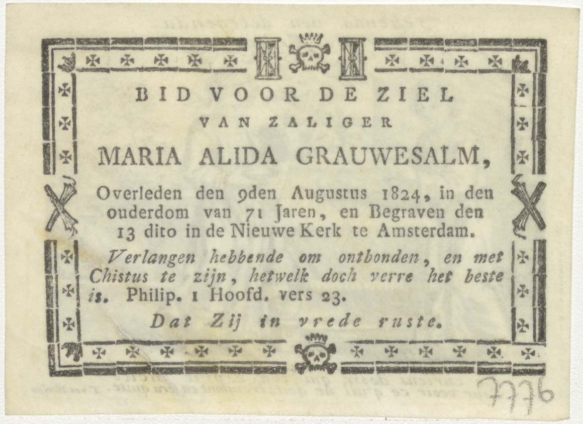 Meisje en jongen rondom tafel met duif (Frans), kz. Bid voor ziel Grauwesalm (+1824) Amsterdam