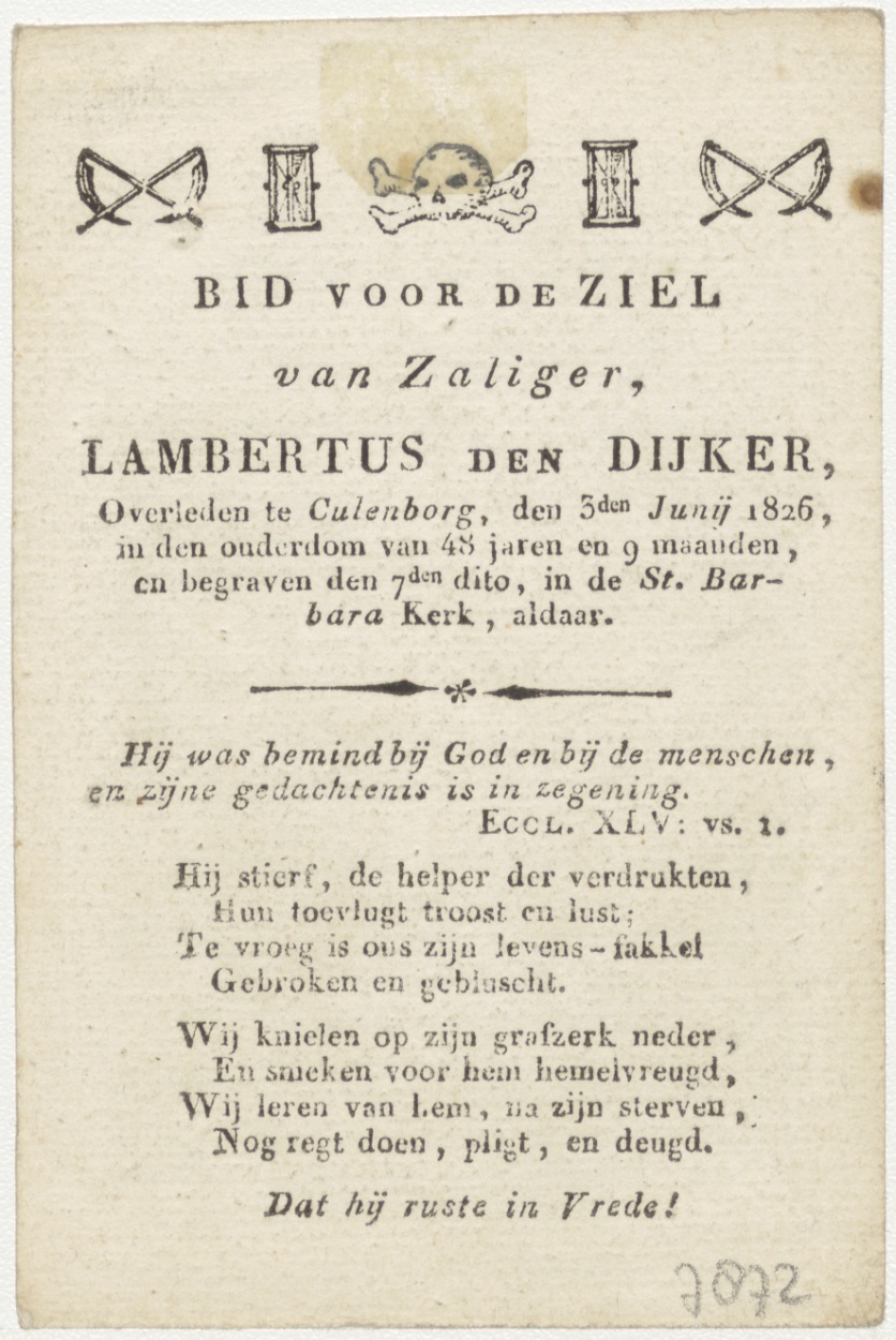 H. Drie-eenheid (Frans), kz. Bid voor ziel Den Dijker (1826) Culemborg