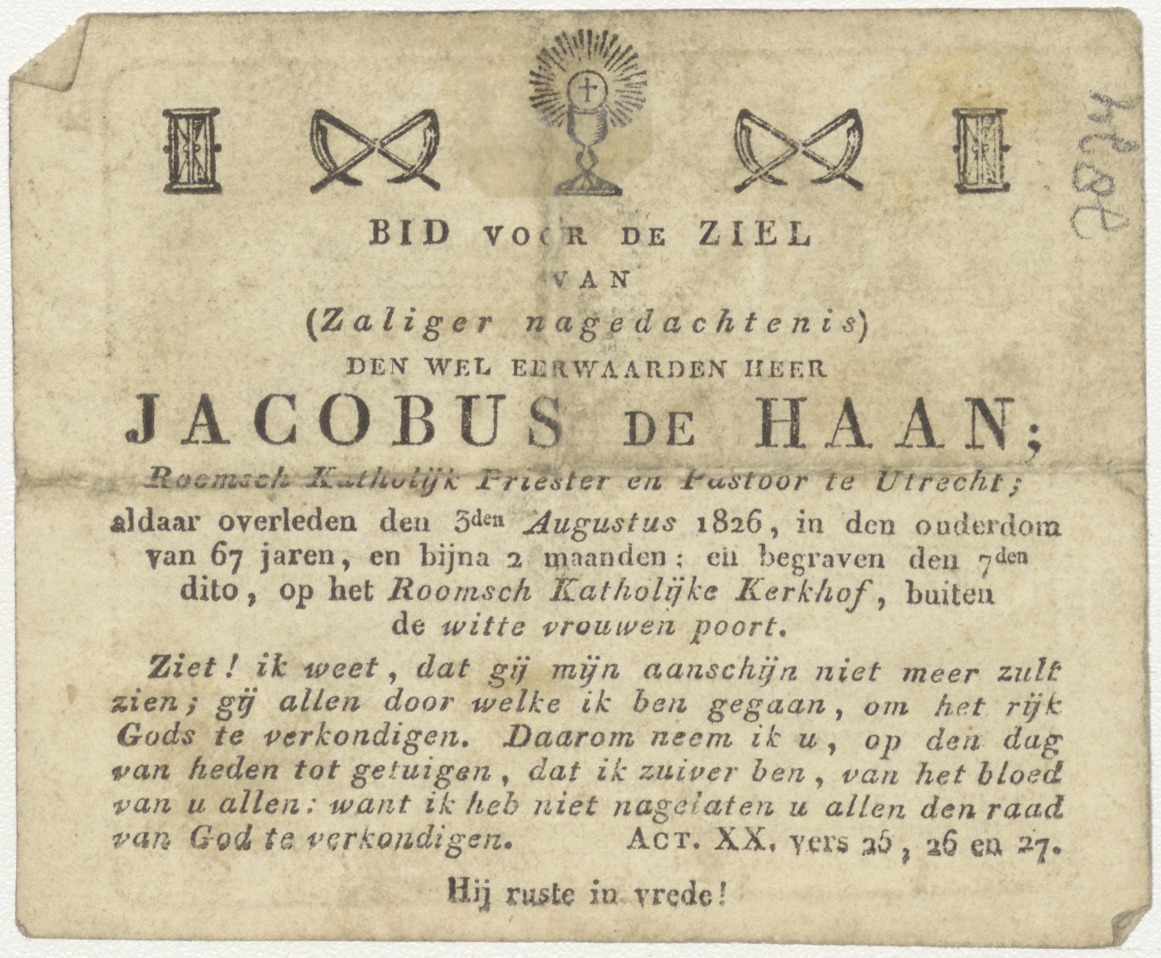 Wonder van Christus; wonder te Kanaän, kz. Religieus; bid voor ziel Jacobus de Haan (+1826) pastoor Utrecht