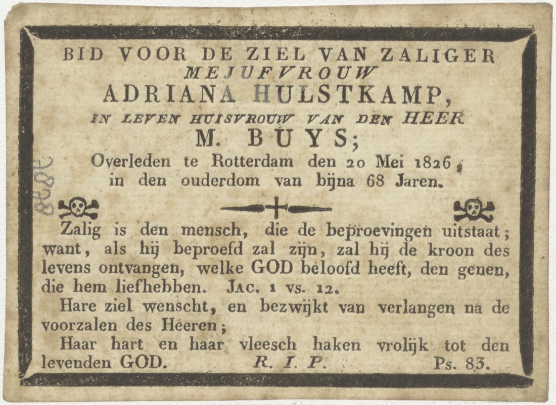 Lijdt ons niet in verzoeking... Onze Vader, kz. Bid voor ziel Buys-Hulstkamp (+1826) Rotterdam