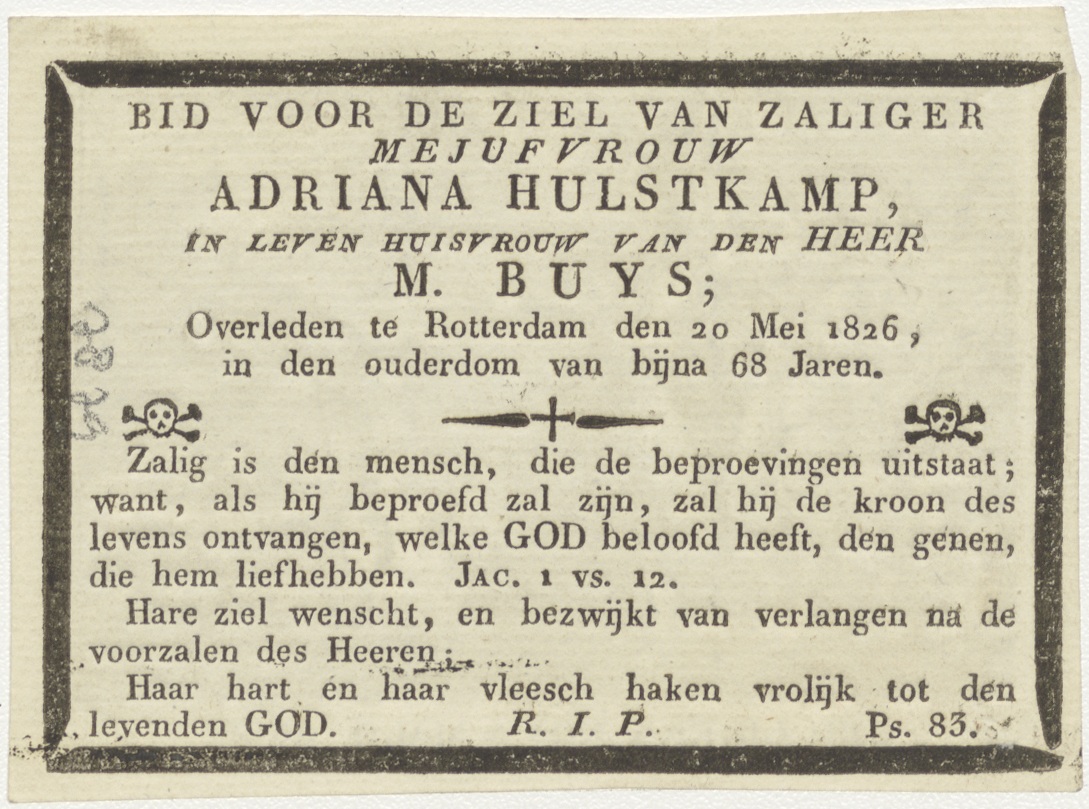Lijdt ons niet in verzoeking... Onze Vader, kz. Bid voor ziel Buys-Hulstkamp (+1826) Rotterdam