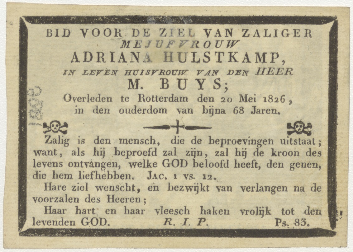 Onze Vader die in de hemelen zijt..., kz. Bid voor ziel Buys-Hulstkamp (+1826) Rotterdam