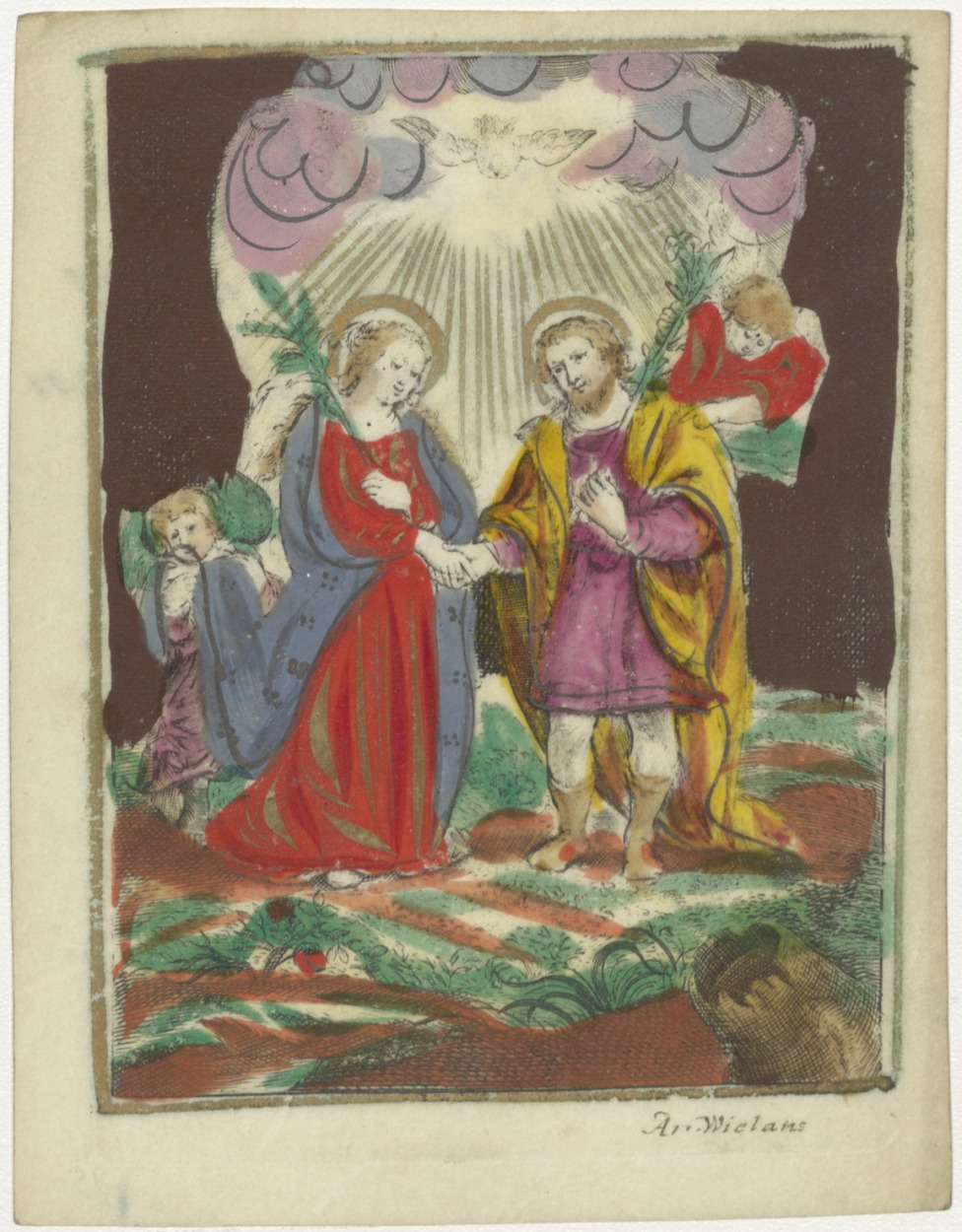 H. Familie met duif, ingekleurd, kz. Van de Ven;die mij lief heeft, die volgt mijne voetstappen na;